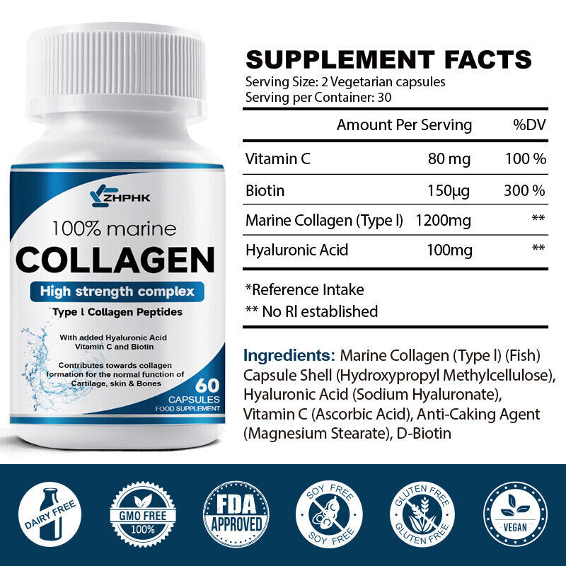 Marine Collagen with Hyaluronic Acid and Vitamin C is a dietary supplement in capsules containing marine fish collagen, hyaluronic acid and vitamin C. The product was created for all people who care about the beautiful and healthy appearance of the skin, as well as people practicing sports after sports injuries or intense physical activity, during recovery after fractures, and to regenerate damaged joints. The proper synthesis of collagen requires the presence of vitamin C. Vitamin C contained in the product helps in the proper production of collagen to ensure the proper functioning of cartilage, gums, skin and teeth.