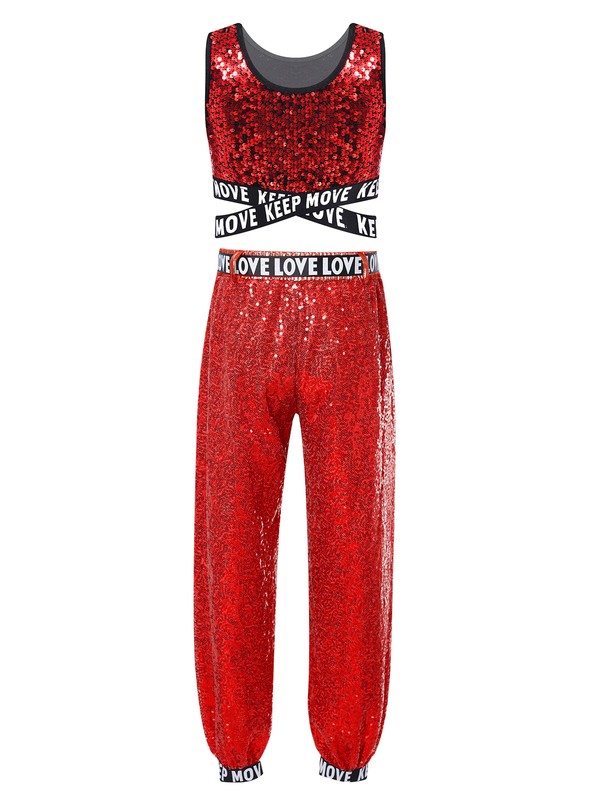 Matching letters printed belt with buckle for easy on or off. This sparkling sequin outfit is eye-catching.