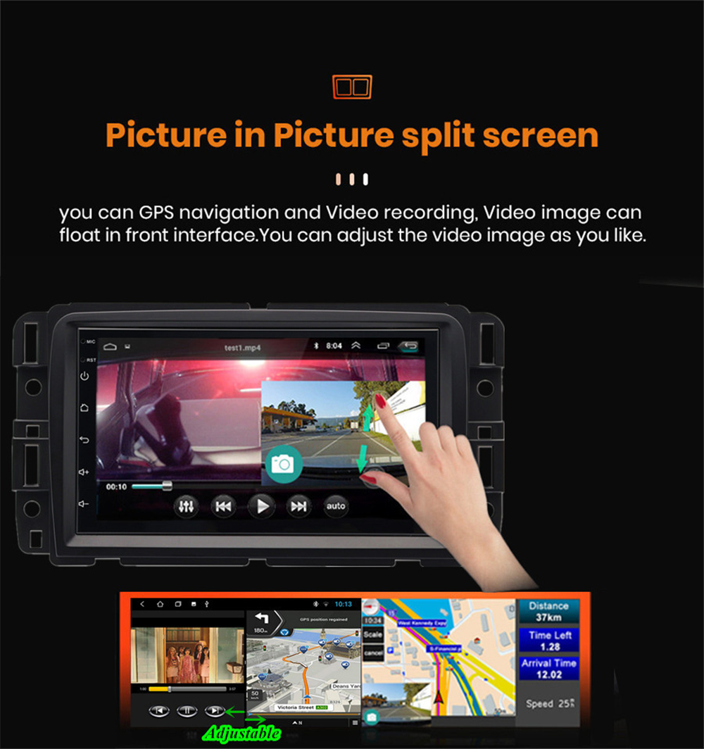 - Touch Screen: Yes - Resolution: 1024*600 - Capacitive or Resistance Screen: Capacitive - Built-in Clock and Calendar: Yes, show real time and can use network-provided time - Main Menu Status Bar display: Can be changed to Music/Radio/BT-Stereo Player and Clock/Date/Week - Change Apps-Icon Position: Yes - Picture in picture split screen:Yes Split screen feature enables you to use two applications at the same time. For example running Navigation with Music Player or Radio with Navigation at the same time. Optimum convenience for both the driver and passengers. |