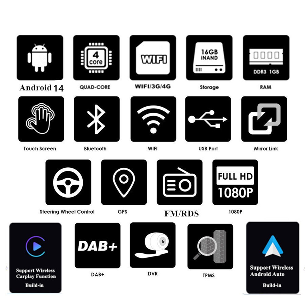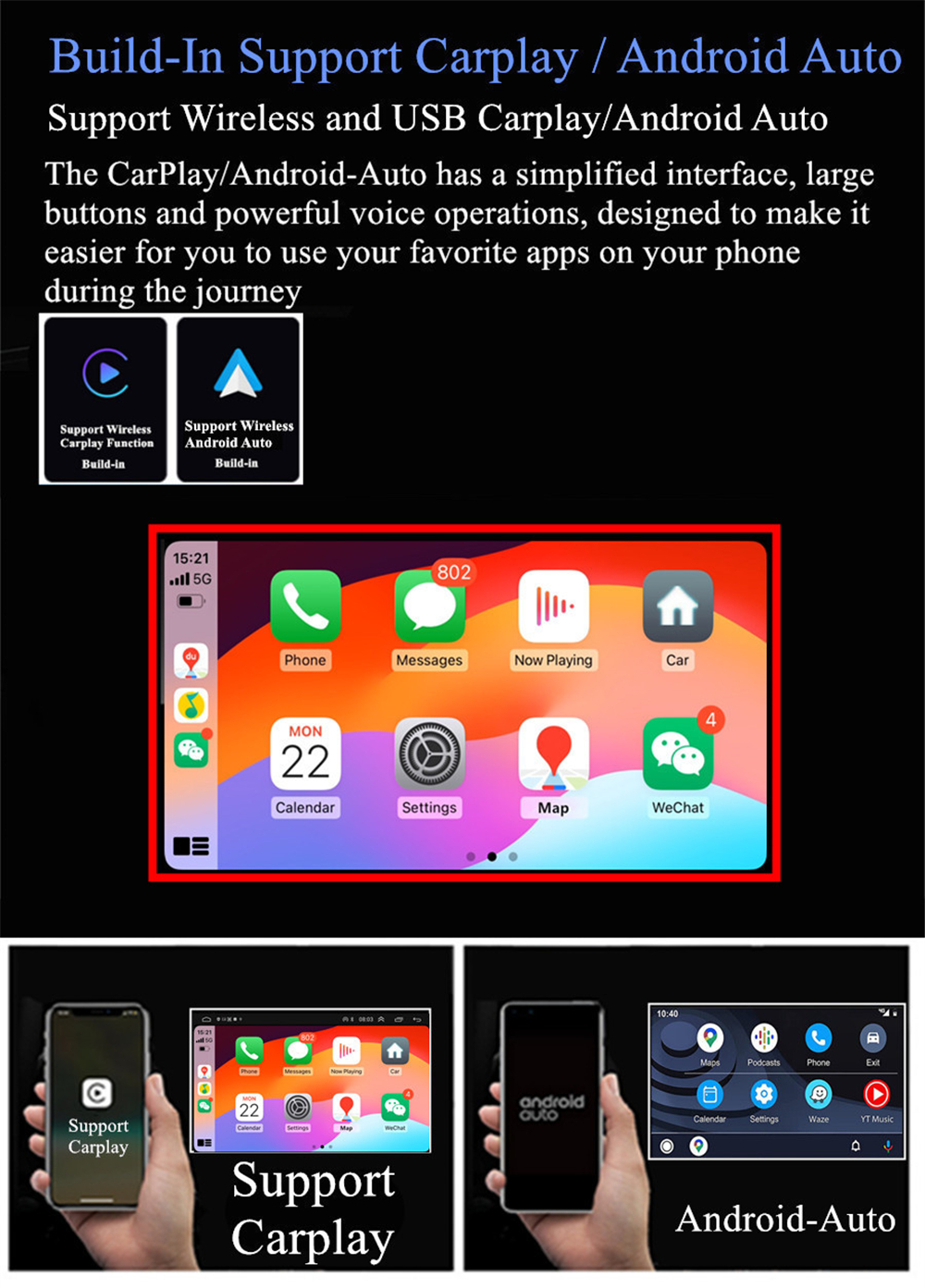 | Support Carplay/Android Auto | -Build-In Support WIFI Wireless & USB Wired Carplay And Android Auto. |