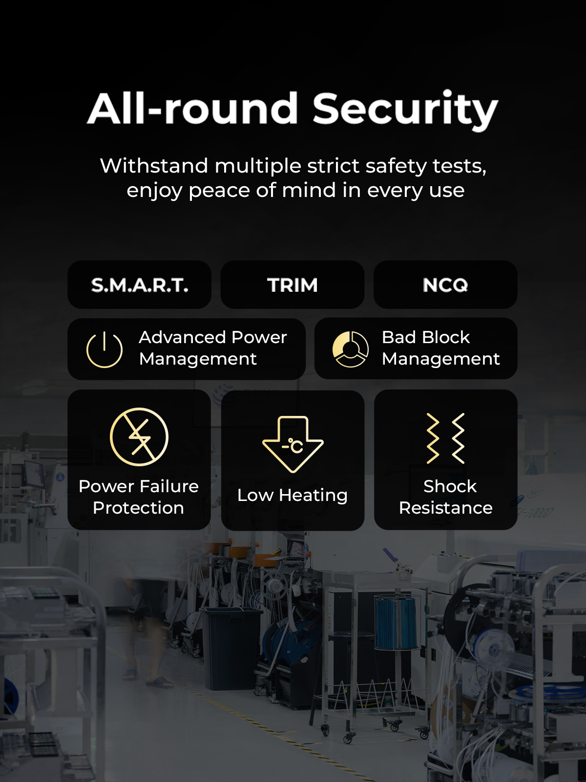 Supports a range of advanced features, including SMART (Self-Monitoring, Analysis and Reporting Technology), NCQ (Command Queuing Protocol), Trim (Garbage Collection Technology) and advanced power management.