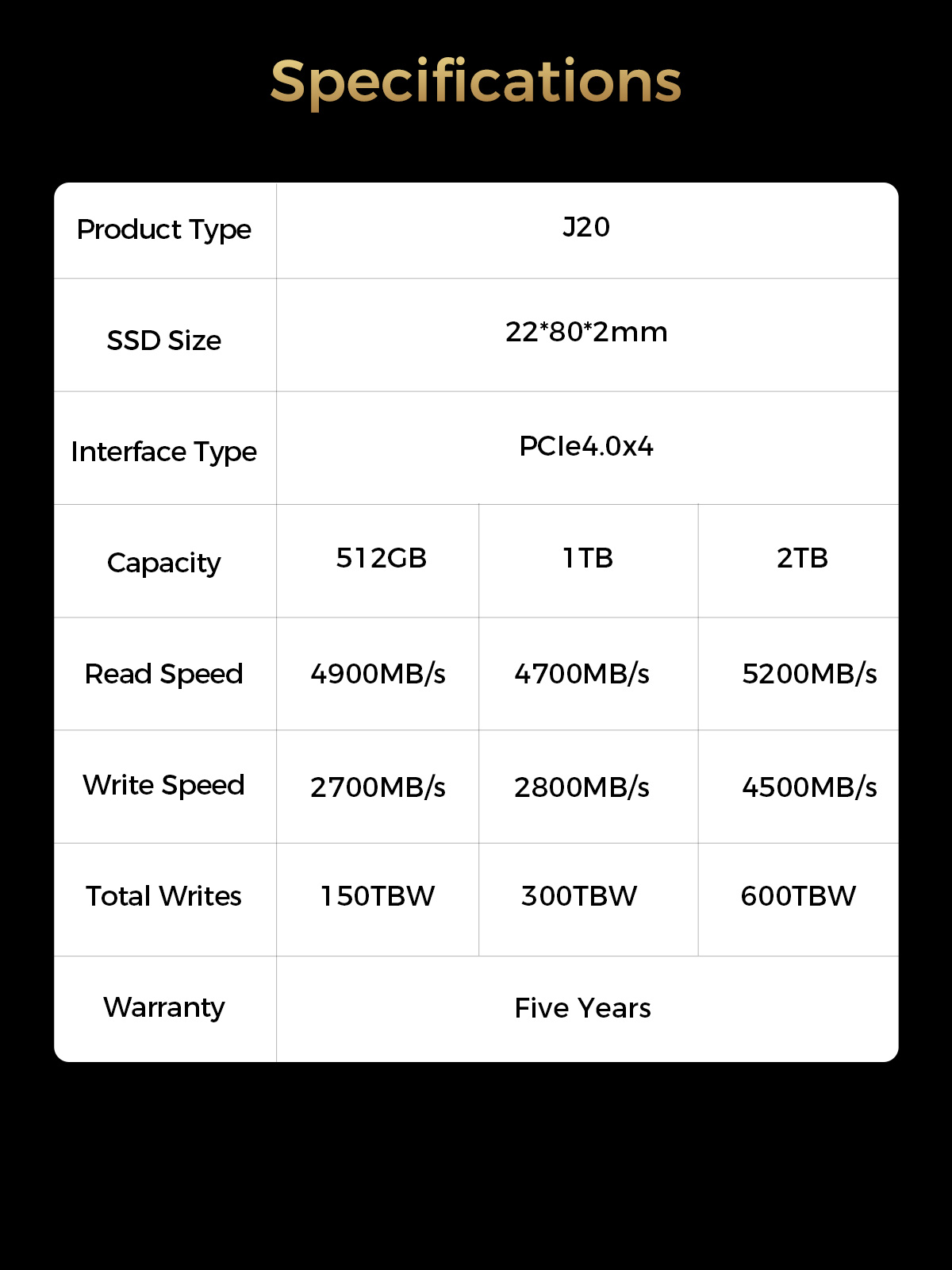 It adopts PCIe 4.0 interface, supports NVMe protocol, and provides a variety of capacity options (512GB, 1TB and 2TB). The reading speed can reach up to 5200MB/s, and the writing speed can reach up to 4500MB/s.