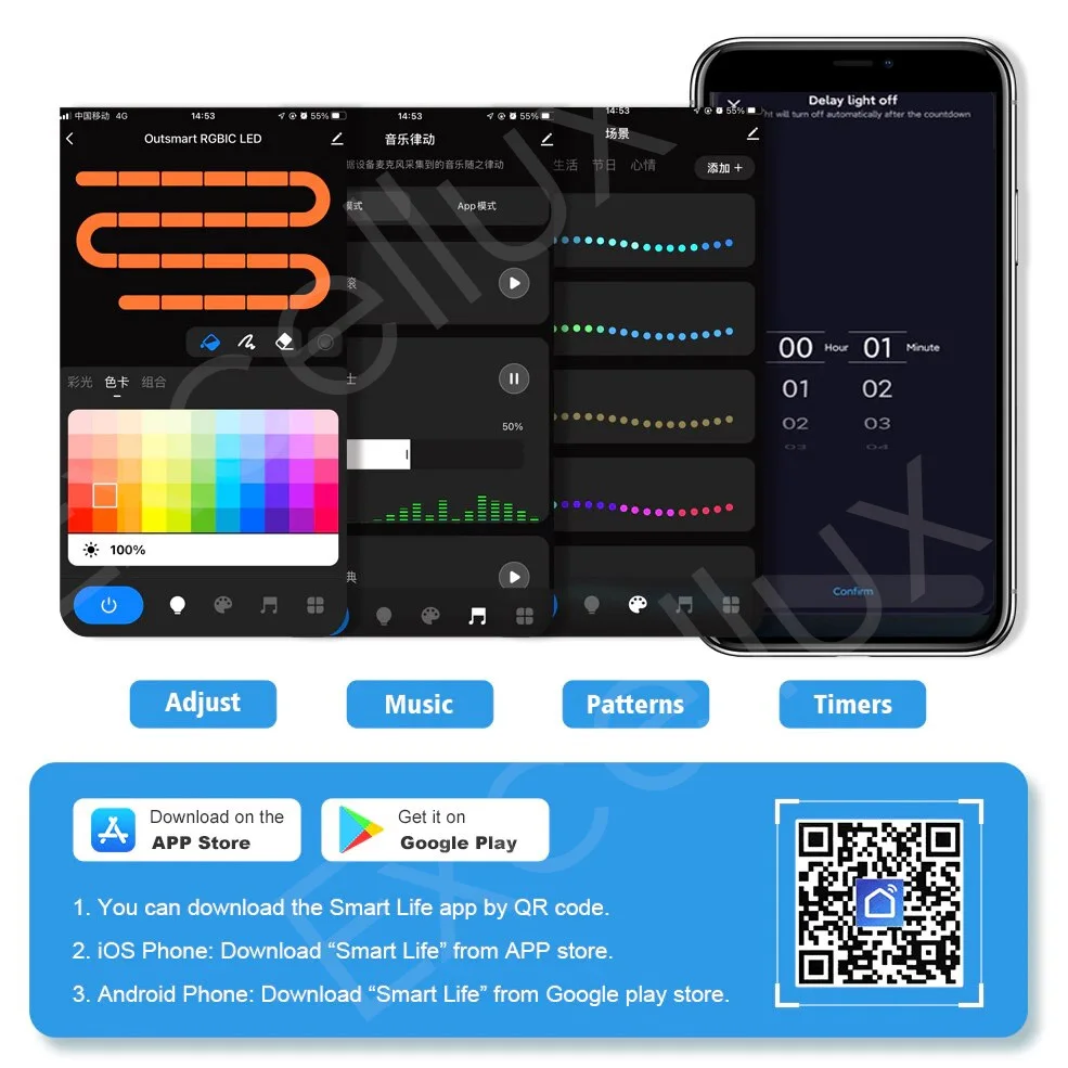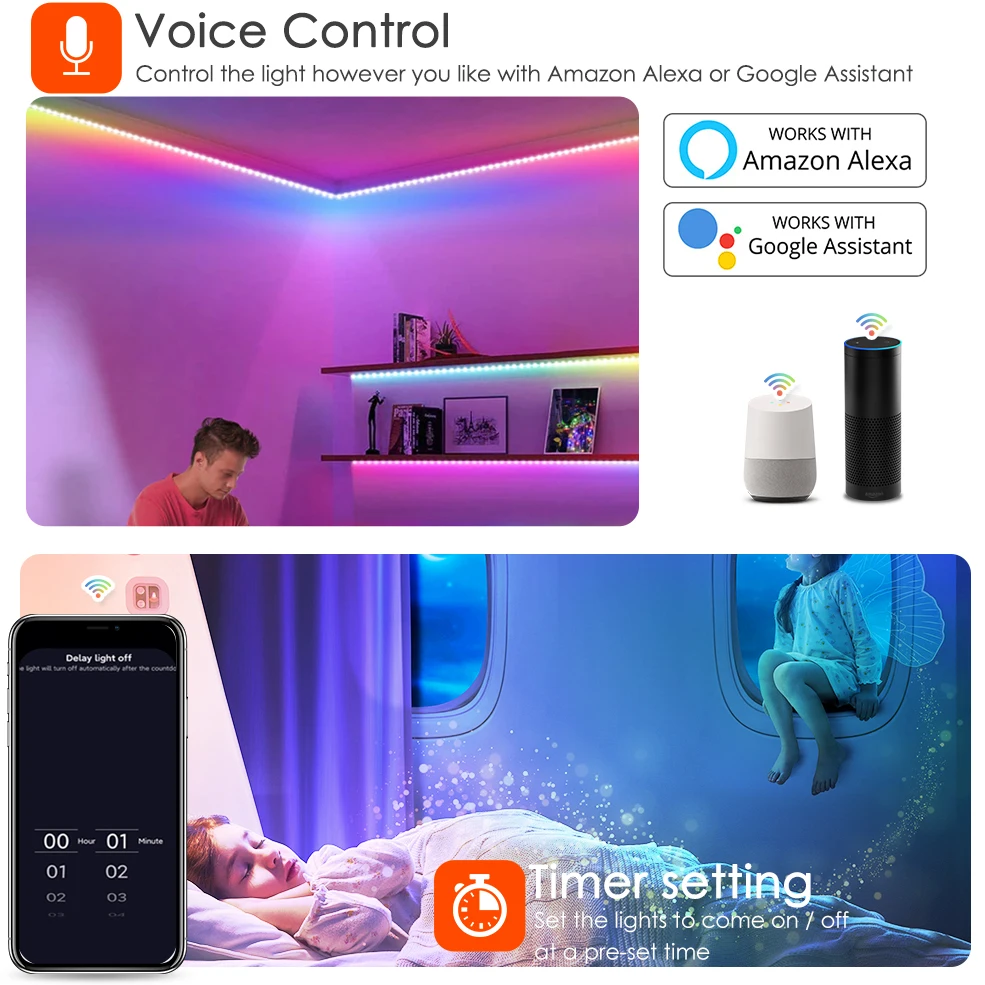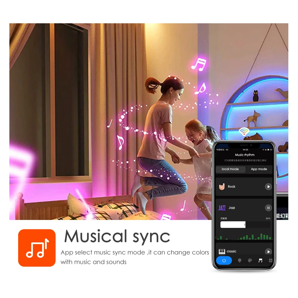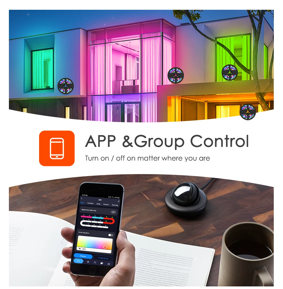 [TUYA Smart/Smart Life APP]: We can control the dream lights by IOS or Android Phone APP via wifi,adjust the color hue,diy colors,brightness,chasing speed and lighting mode.