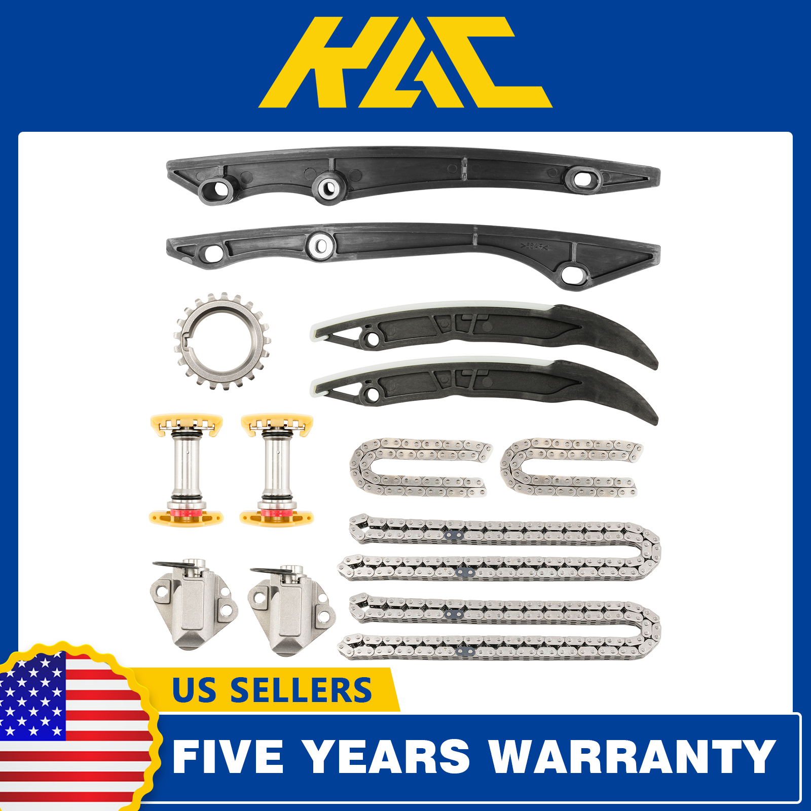 Timing Chain Kit Fit 11-15 For ford F150 Mustang 5.0L . The timing chain is located in the front of the motor and is attached to a set of gears and pulleys that power multiple mechanical components, including the crankshaft and camshaft. In order for your engine to fire, the timing chain must smoothly rotate around the gears without hesitation. Although the timing chain is made out of metal, it is subject to wear and tear and may break if not replaced as recommended by the factory. Since the timing chain can go bad and will need to be replaced, it is important to be able to recognize the symptoms so you can have it repaired before it fails completely. Signs your timing chain needs to be replaced include: Your vehicle has a rough idle, meaning your engine shakes. Your car backfires. The vehicle seems to be working harder than normal. Your car will not start at all, indicated a complete timing chain failure. Be sure to use our aftermarket replacement timing chain kit when your timing chain is serviced for the best performance.