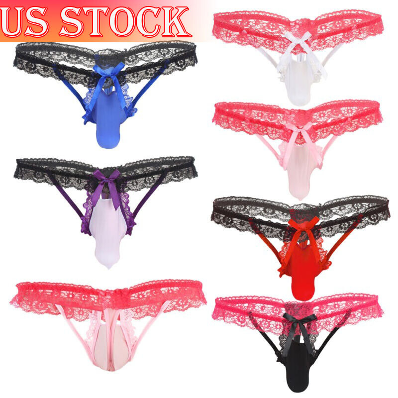 Men’s thong, strap waistband, T-back style, with mesh and lace flower design.