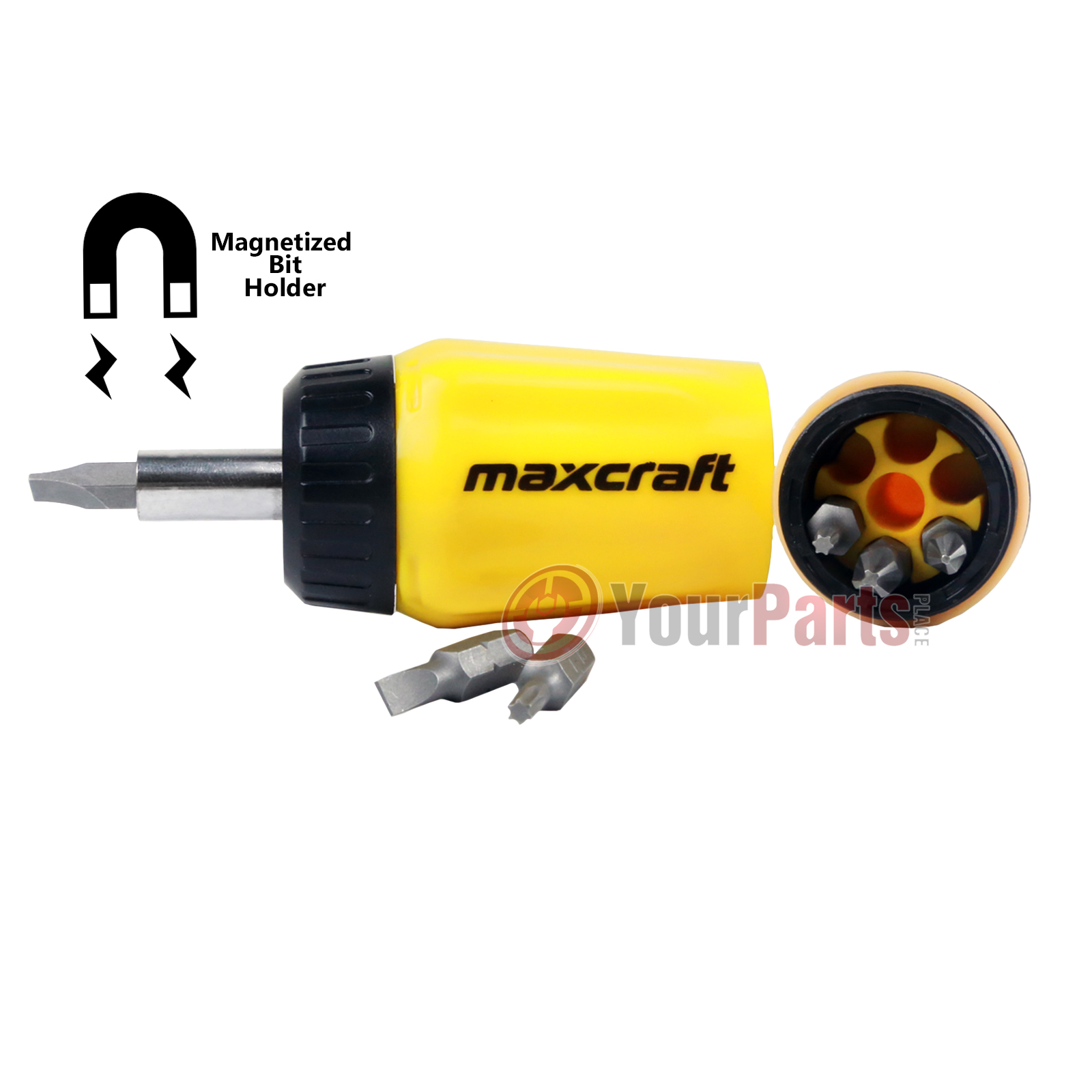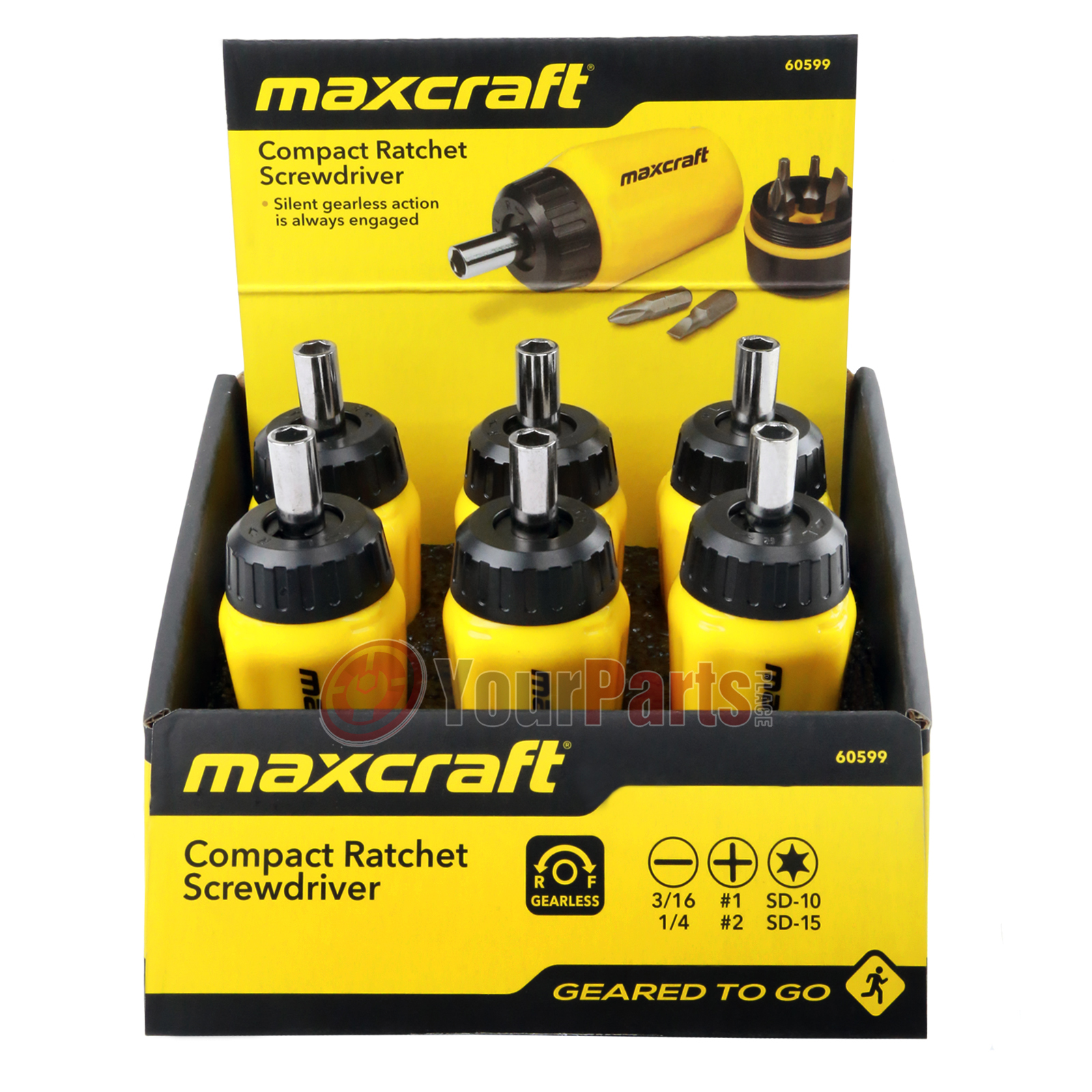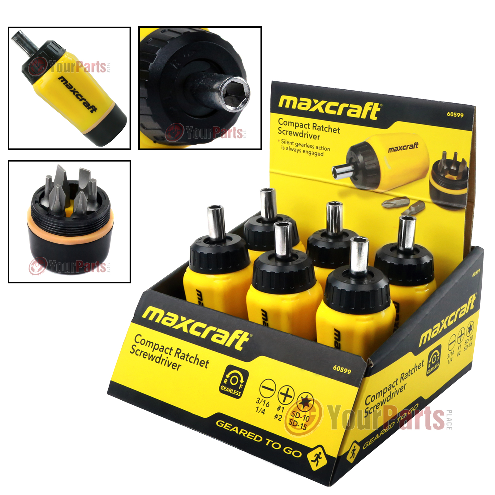 These Maxcraft gearless stubby ratchet screwdrivers are perfect for home or commercial use! Features a gearless ratchet design that locks at any 360-degree position for easy driving even in the most difficult and limiting work areas. It drives both forward and in reverse, and the rugged nylon handle is impact-resistant while the easy grip allows for more torque. The bits are precision machined sandblasted Chrome Vanadium alloy steel, making them rust and corrosion-resistant, and the six bits stored conveniently in the handle. This six-pack makes any store front counter pop and adds value to customer purchases.