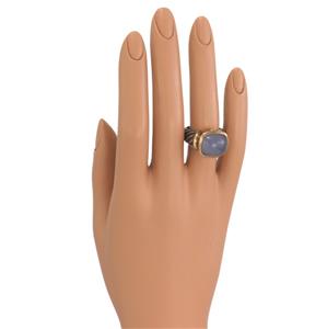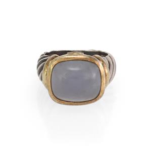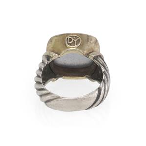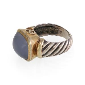 This authentic ring is by David Yurman from the Nobelesse collection. It is crafted from sterling silver and 14k yellow gold featuring a tapered cable style band, the front center has an oval shape frame in yellow gold and mounted in the frame is a beautiful blue chalcedony gemstone. The ring hallmark by the designer with the metal content.