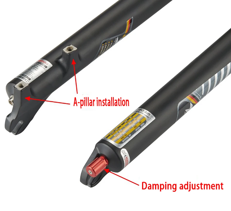 Straight tube: (black/golden stroke tube) stroke 120mm, compressible 100 mm, inner tube outer diameter: 32mm, standpipe length: 220mm, standpipe outer diameter: 28.6mm, pipe wall outer diameter: 38mm, fork leg installation method: quick disassembly type, left shoulder belt rebound adjustment, brake seat: A-pillar type, supporting 160mm-185mm disc.