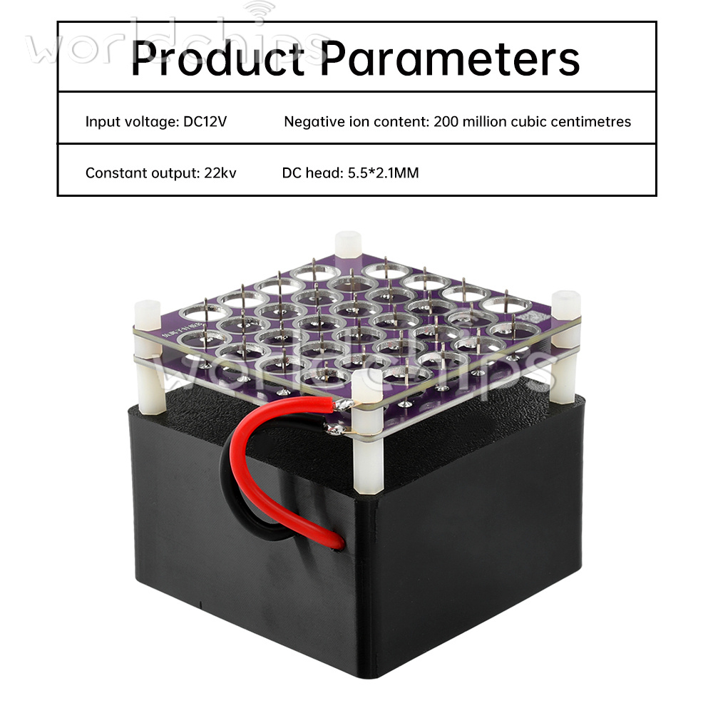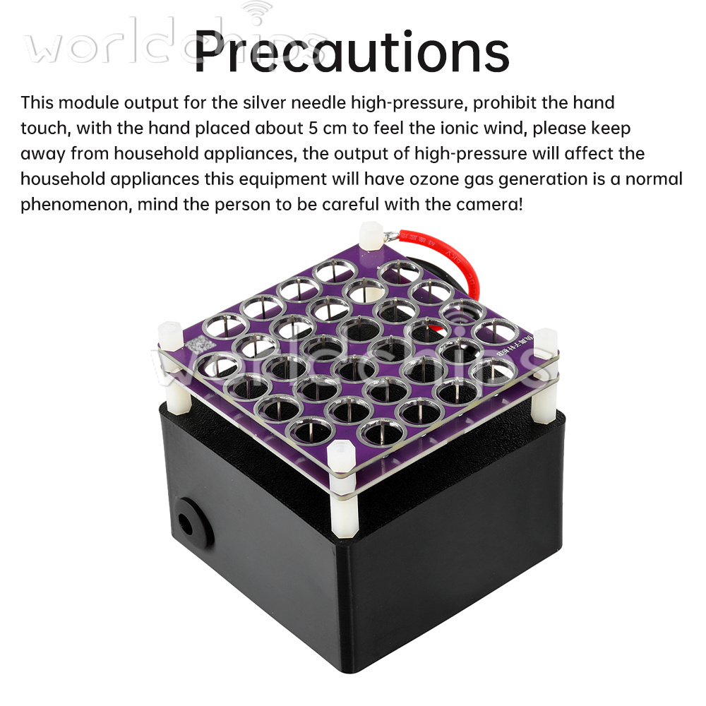 This module output for the silver needle high-pressure, prohibit the hand touch, with the hand placed about 5 cm away to feel the ion wind, please keep away from household appliances, the output of high-pressure will affect the household appliances this equipment will have ozone gas generation is a normal phenomenon, mind the person who cautiously shoot!