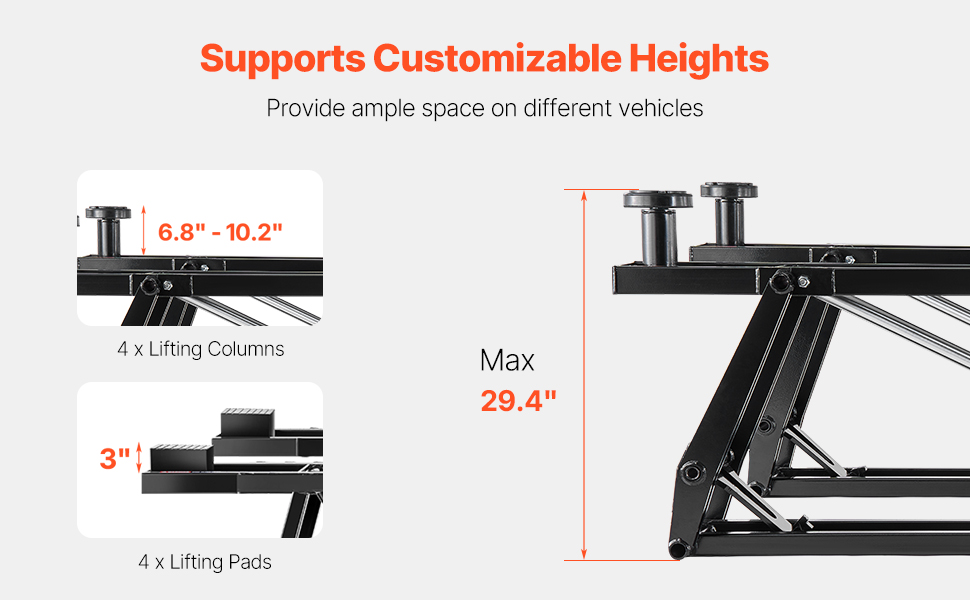 Adjustable Lift Height: With plenty of bottom space, the lift can lift between 3.5" - 21.0" / 95 - 533 mm with three locking positions. Four additional 3" high pads and four adjustable lifting columns are provided for increasing lift height or reaching lift points on high chassis vehicles. Maximum lift height is up to 29.4" / 748 mm when using the lifting posts.