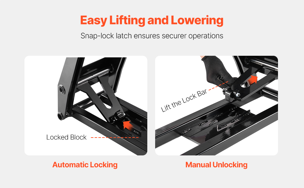 Security First: We use a unique snap-on security lock that secures in place when the vehicle is raised to the desired height, avoiding any unwanted sliding and safeguarding undercarriage work. Please make sure the locking lever is in the locked position before working under the vehicle. Please lift the locking lever of the security lock before lowering.