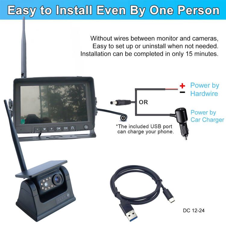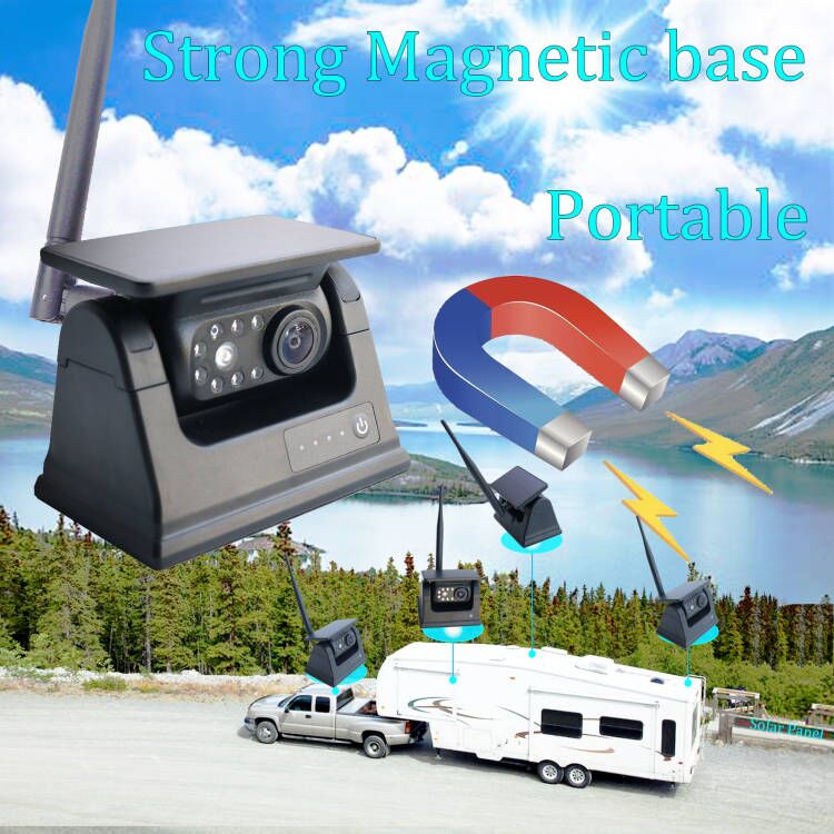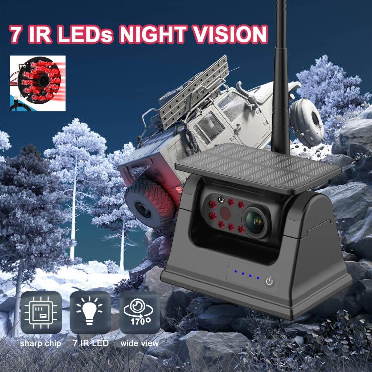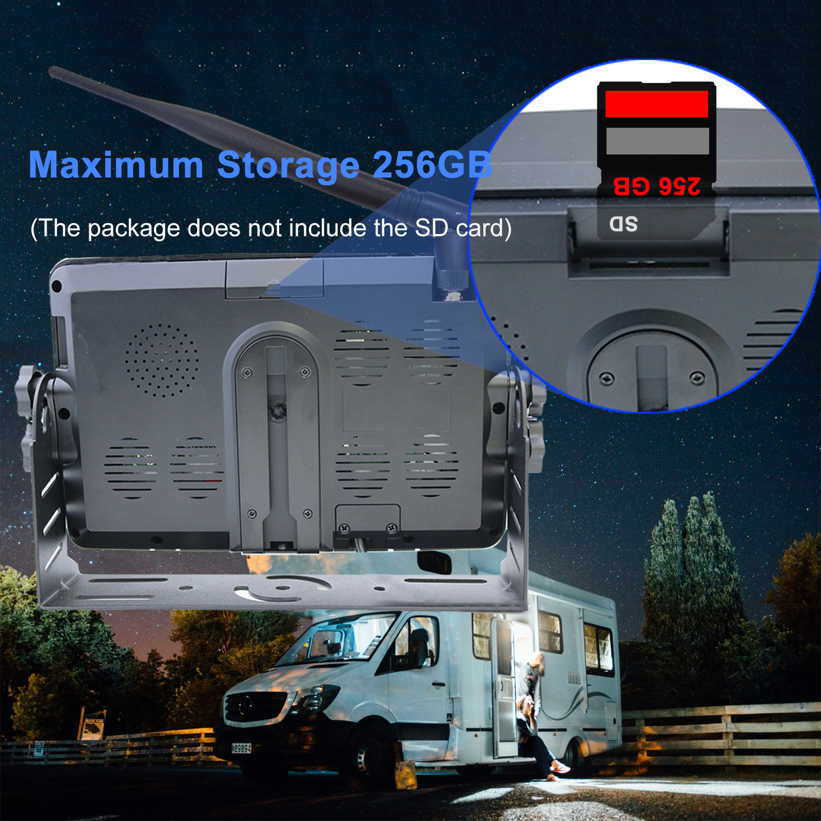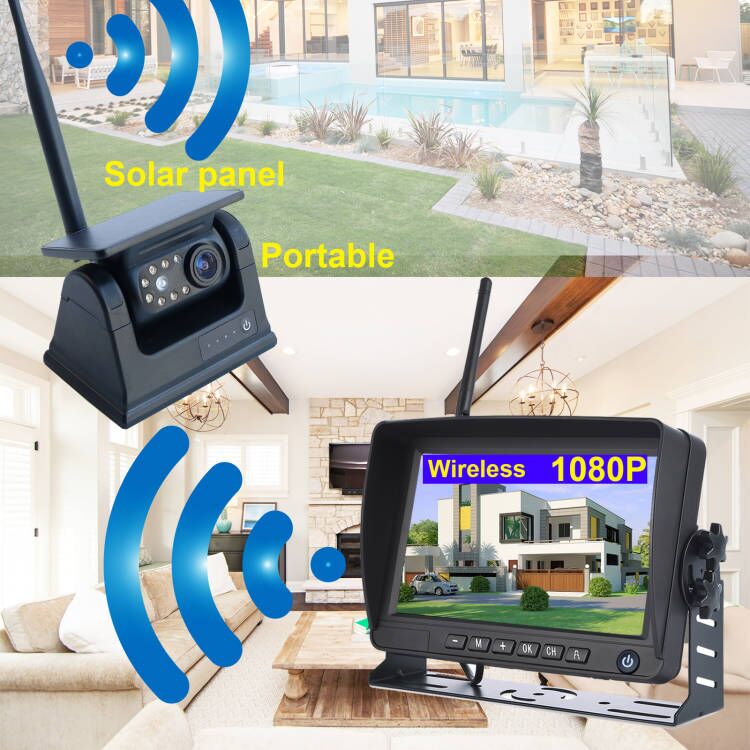 iPoster 7" Digital Wireless 4 Channels Splitscreen Monitor with Built-in DVR-Loop Recording Max support 256GB Card +Wireless 1080P Backup Rear View Camera with Solar Panel / 9000mah Rechargeable Battery/7 IR Leds Night Vision 150° Viewing DC12-36V For Truck Trailer RV Caravan Camper