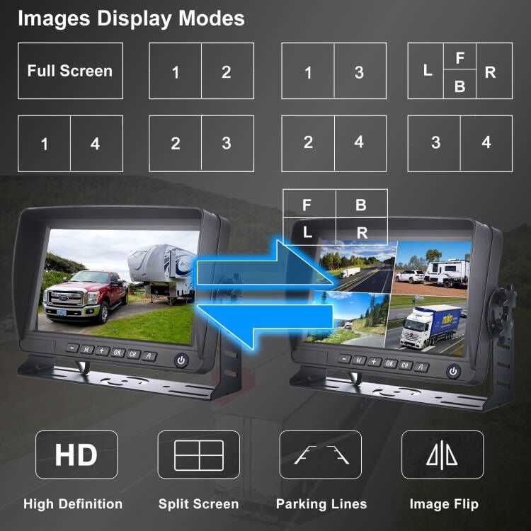 ► 【Guideline】Trailer backup camera with super large HD 1080P 7" monitor. The image is super clear and any distortion is reduced to a minimum. Thus, you will get to enjoy a flawless parking and driving experience. The image could be flipped between mirror(rear view) and facing(front view). Backup lines optional to turns on/off.