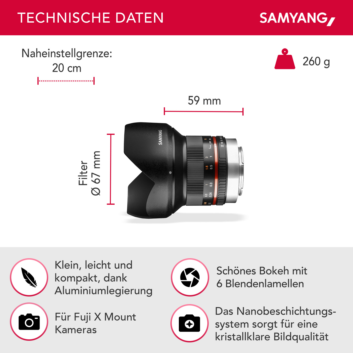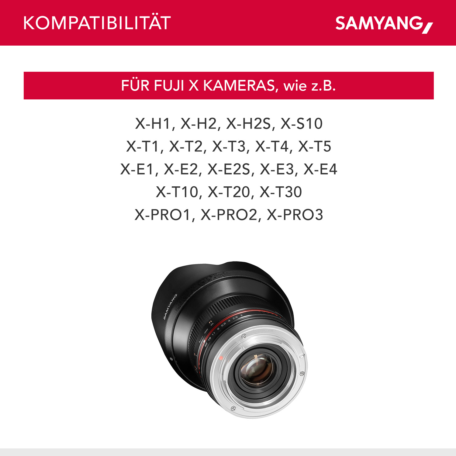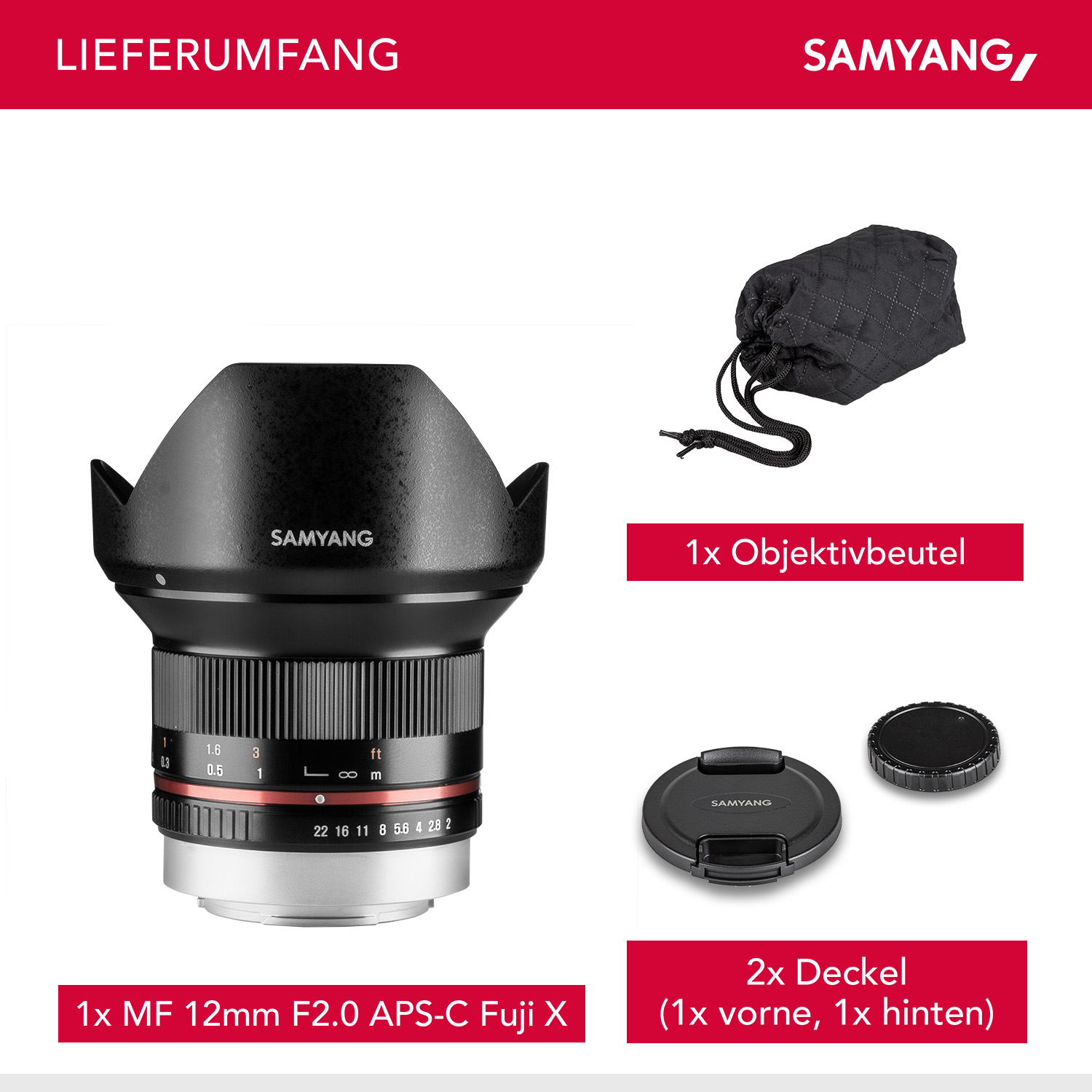 | Accessori | • 1x Samyang MF 12mm F2.0 für Fuji X-Mount schwarz • 1x Objektivbeutel • 1x Gegenlichtblende • 1x Frontdeckel, 1x Rückdeckel • 1x Gebrauchsanleitung deutsch und englisch |