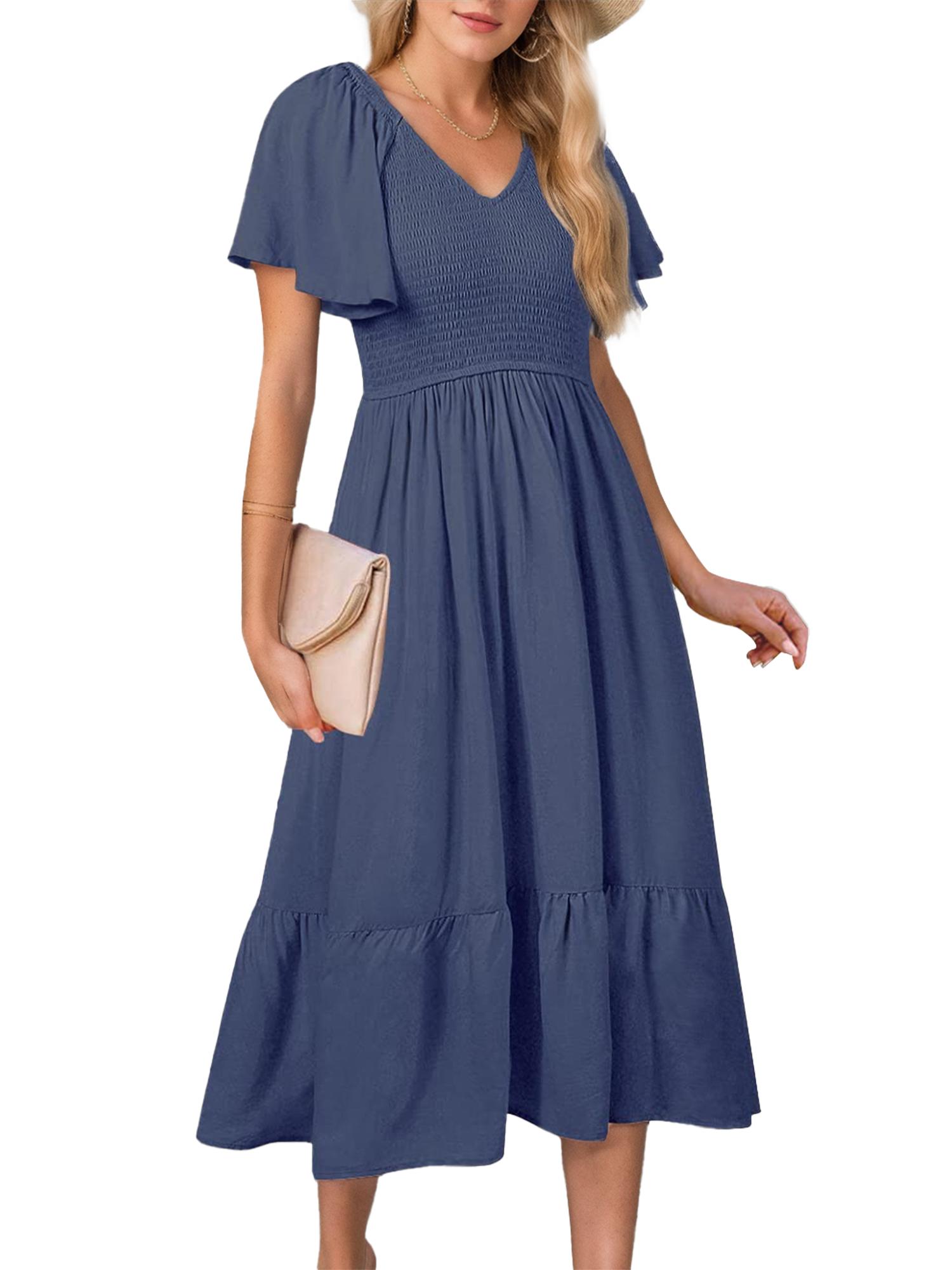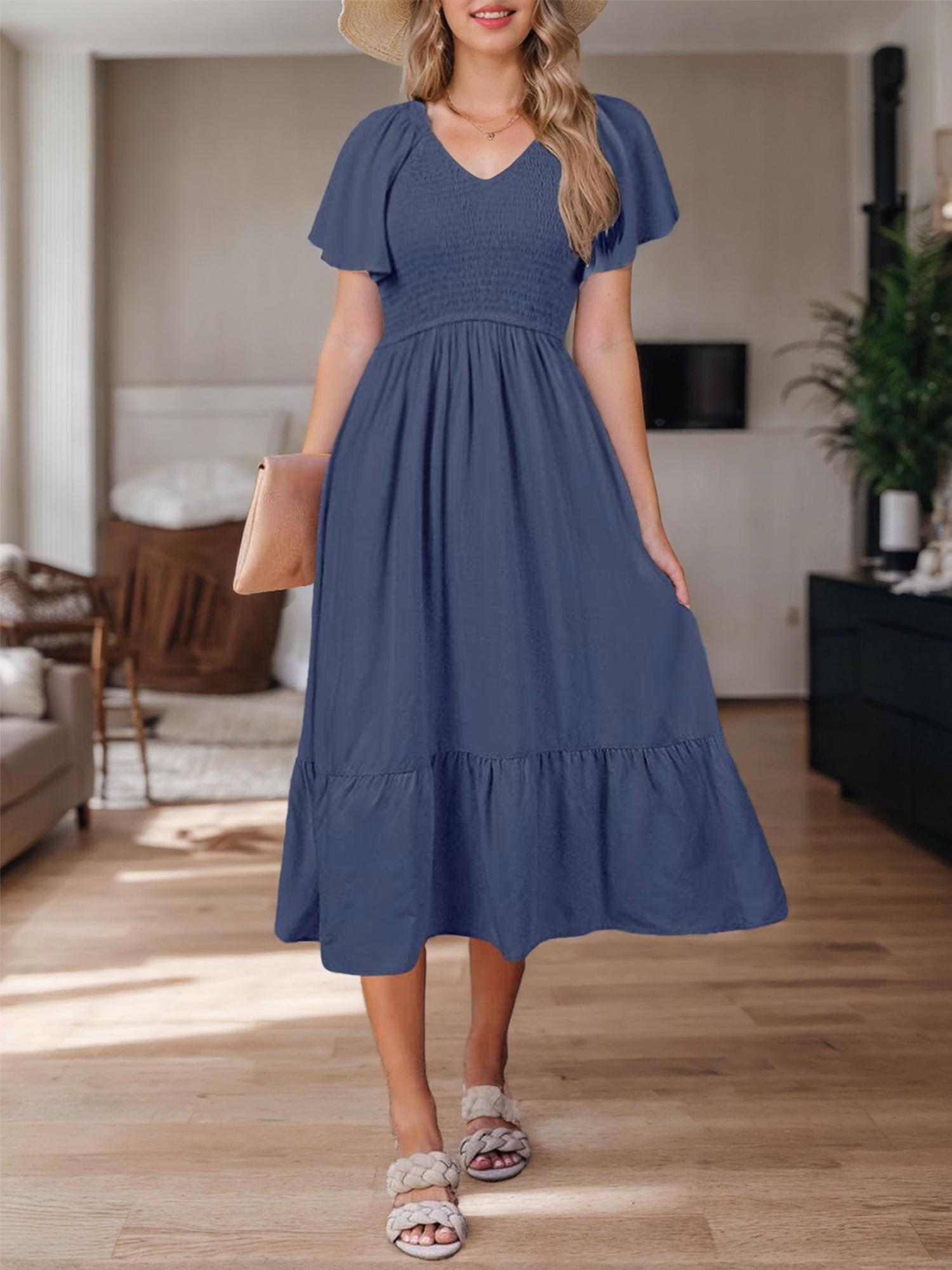 Unique design: Ruffle short sleeve, v-neck, elastic high waist, solid color, stretchy shirred tops, swing a-line style midi dress, fully lined not see-through, two side pockets.