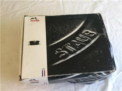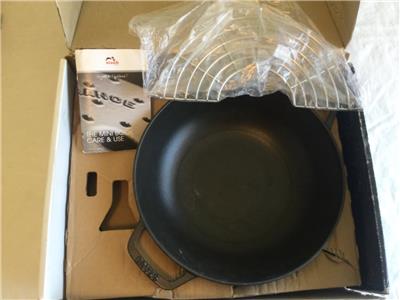 This listing is for a Staub wok which was purchased as overstock inventory. The wok is brand new and comes in it's original retail packaging. The box shows some wear from being handled and we found a small scuff on the glass see picture 6. Thanks for visiting our listing and good luck.