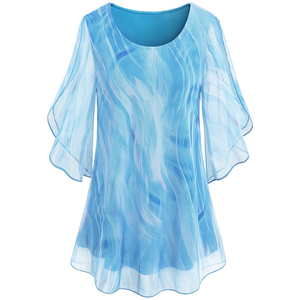 Womens Ruffle 3/4 Sleeve Mesh Blouses Loose Flowy Tops Stretchy Shirts