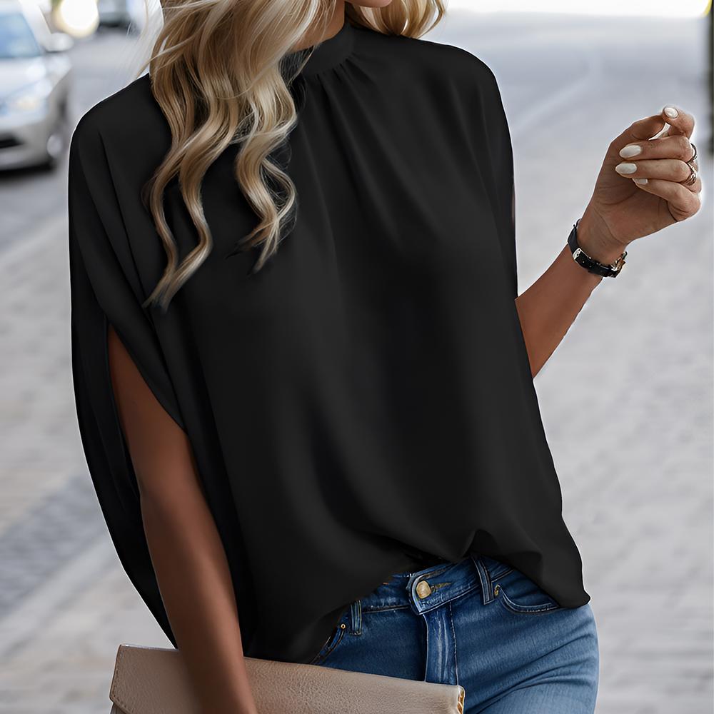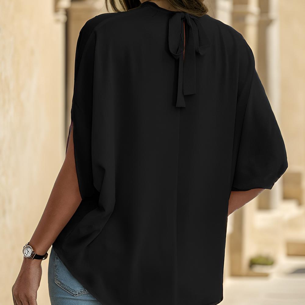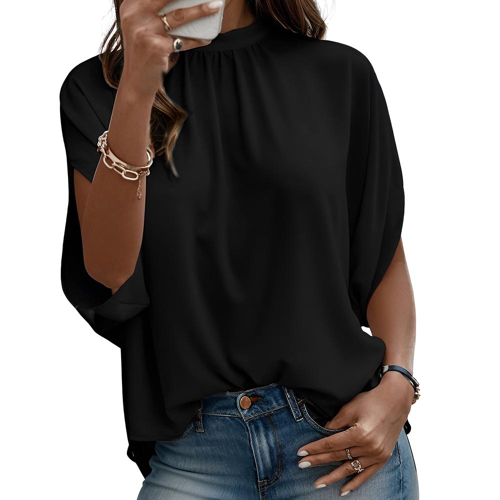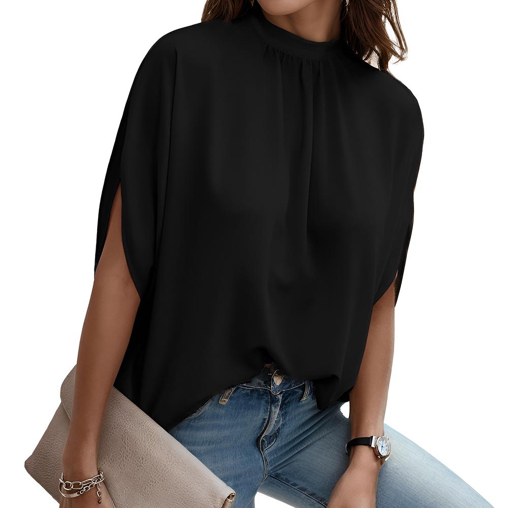 TOPS DESIGN: Batwing sleeve, solid color, pleated, crewneck, short sleeve, round neck, loose fit, self tie, drape, casual, trendy and elegant.