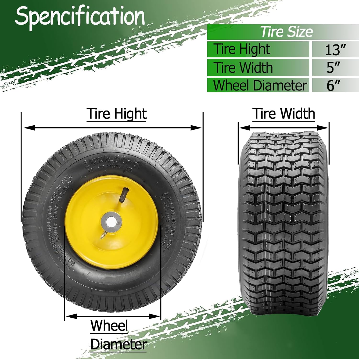【Product Specifications】Tire Size: 13x5.00-6"; Hub Type: Centered Hub; Hub Length: 3"; Bushing Diameter: 3/4"; Load Capacity: 300lbs; Type: Pneumatic Tires.