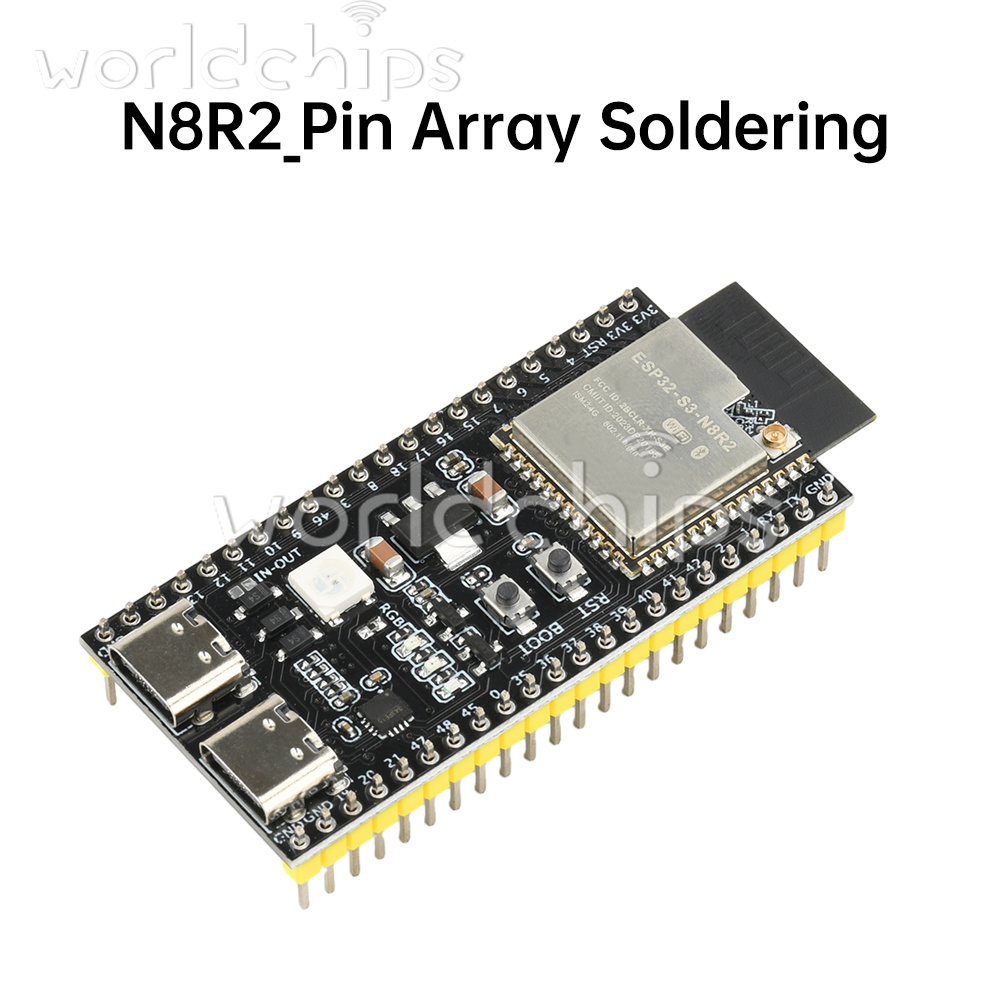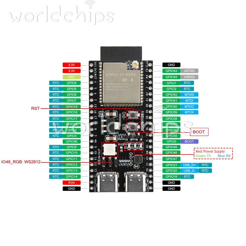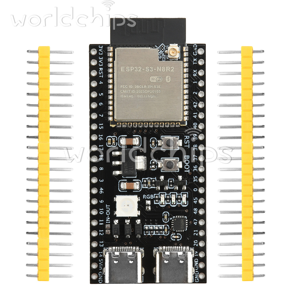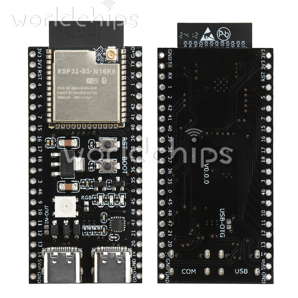 The product is based on the ESP32-S3-WM-1 module development board, there are more IO ports, onboard WS2818RGB, corresponding to IO48. with two Type-C ports, one can be used directly, with COM marking, the other USB can be used with OTG or hold down the BOOT power on the port can be displayed normally and download the program, the factory program is to connect WiFi after the RGB lights up automatically and goes out when disconnected.