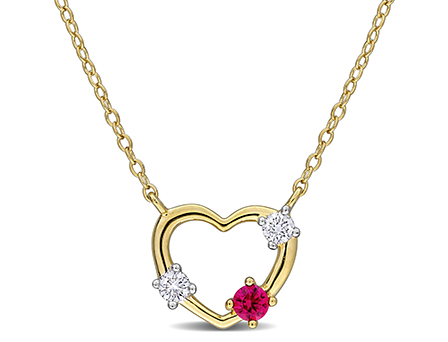 This charming open heart necklace features a vibrant created ruby and sparkling lab-grown diamonds set in yellow-plated sterling silver. The delicate heart design is beautifully accented with a pop of color and elegance, making it a perfect addition to any jewelry collection. With a 17-inch chain, this necklace offers a sophisticated yet playful look that is perfect for everyday wear or special occasions. A timeless piece that expresses love and affection, it’s an ideal gift for a loved one.
