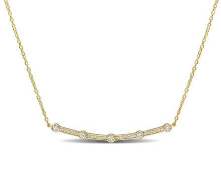 Add a touch of elegance with this curve bar necklace, featuring 1/3 TW of lab-grown diamonds set in 18k yellow gold plated sterling silver. The sleek, curved bar design is complemented by the dazzling diamonds, offering a sophisticated and modern look. With a 17-inch chain, this necklace is perfect for layering or wearing on its own to elevate any outfit. A chic and timeless piece for your jewelry collection.