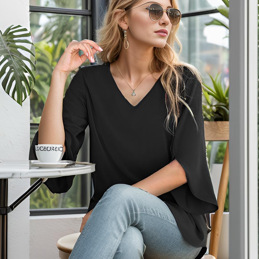 Features: Casual chiffon blouse, v-neck, half ruffle split sleeve, two layers design, 3/4 sleeve tops, chiffon shirts loose fit