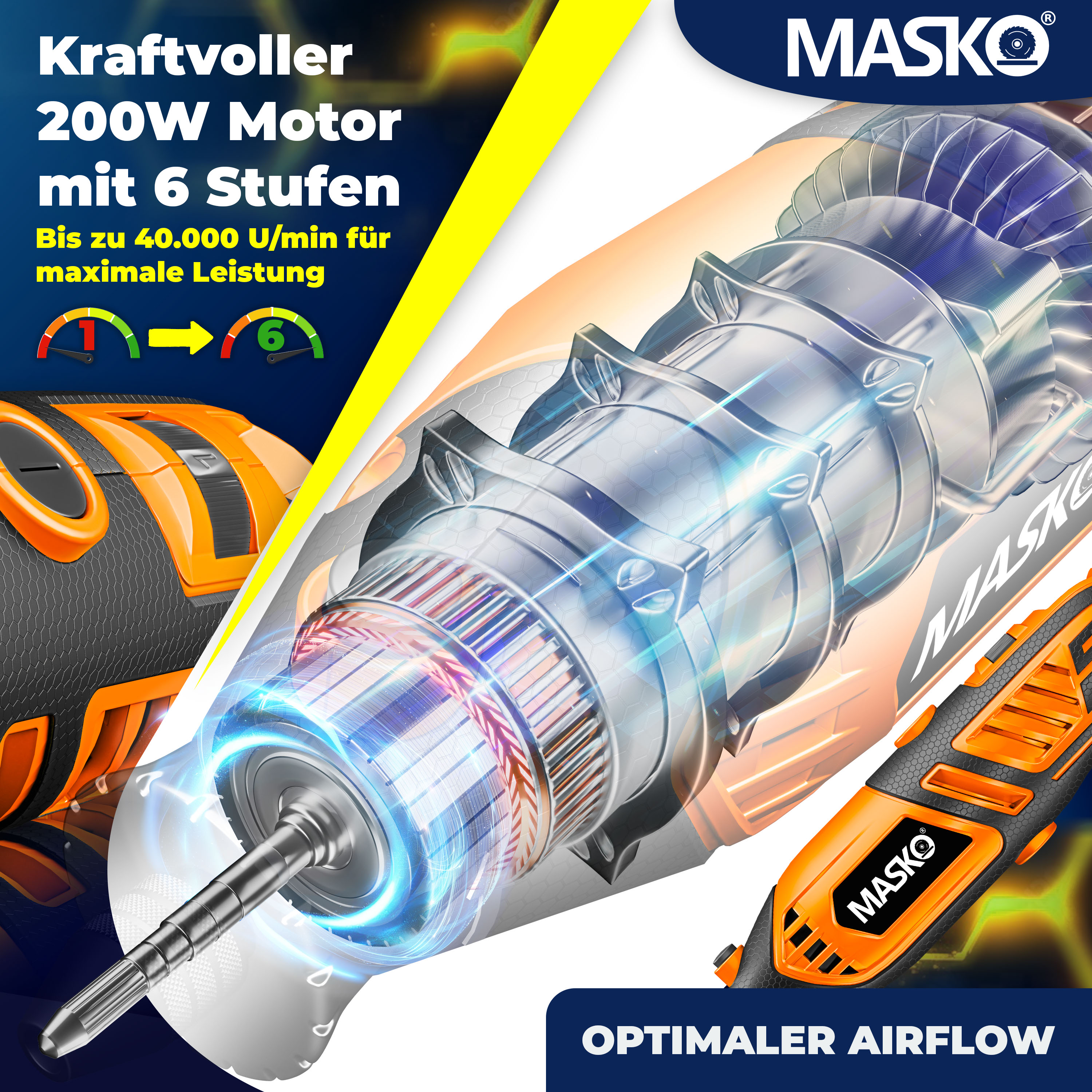 LEISTUNGSSTARKER 200W MOTOR MIT 6 GESCHWINDIGKEITSSTUFEN: Mit einer Drehzahl von 10.000 bis 40.000 U/min bietet das MASKO® Multifunktionswerkzeug optimale Power für präzise Arbeiten. Ideal für das Schneiden, Schleifen, Bohren oder Polieren von verschiedenen Materialien – von Holz bis Kunststoff.