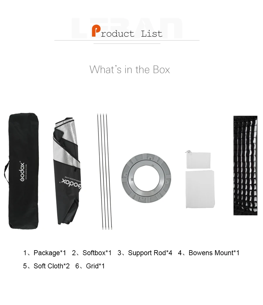 Accessories: Includes softbox, metal mounting ring, inner soft cloth, and grid