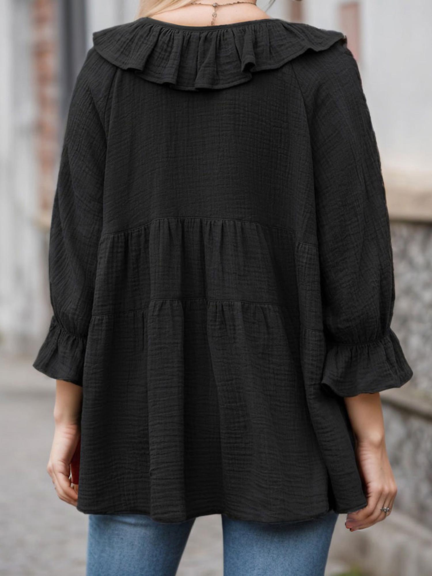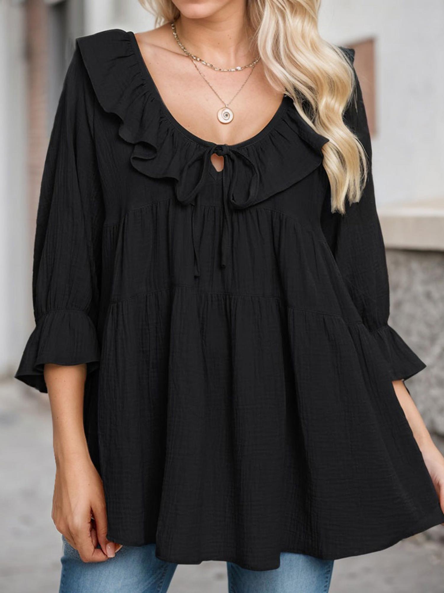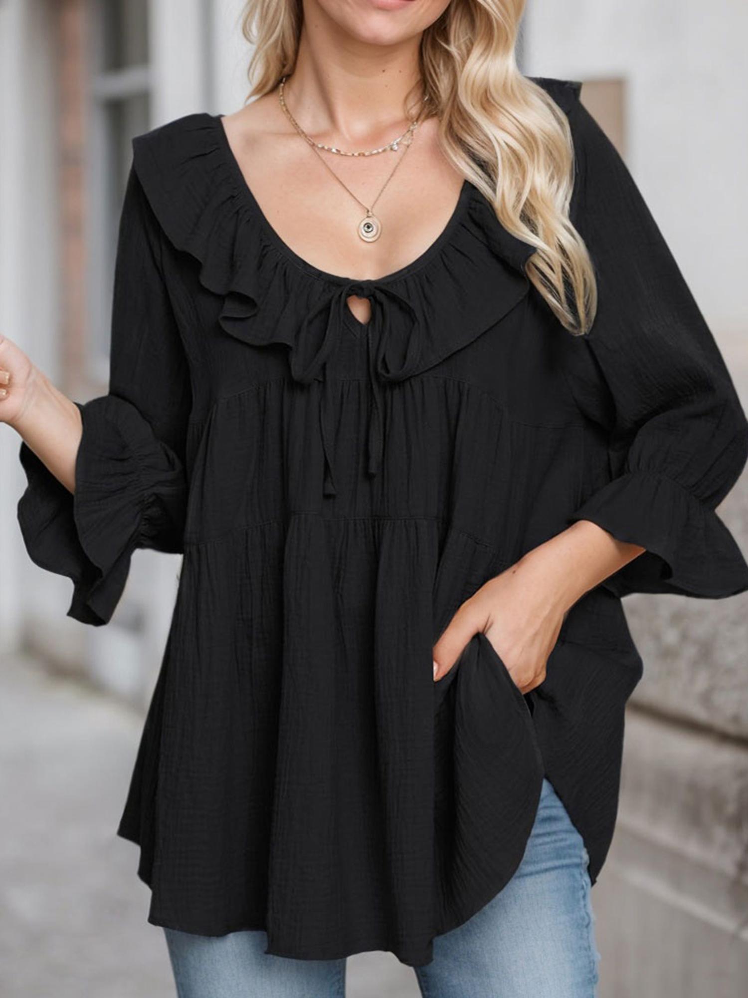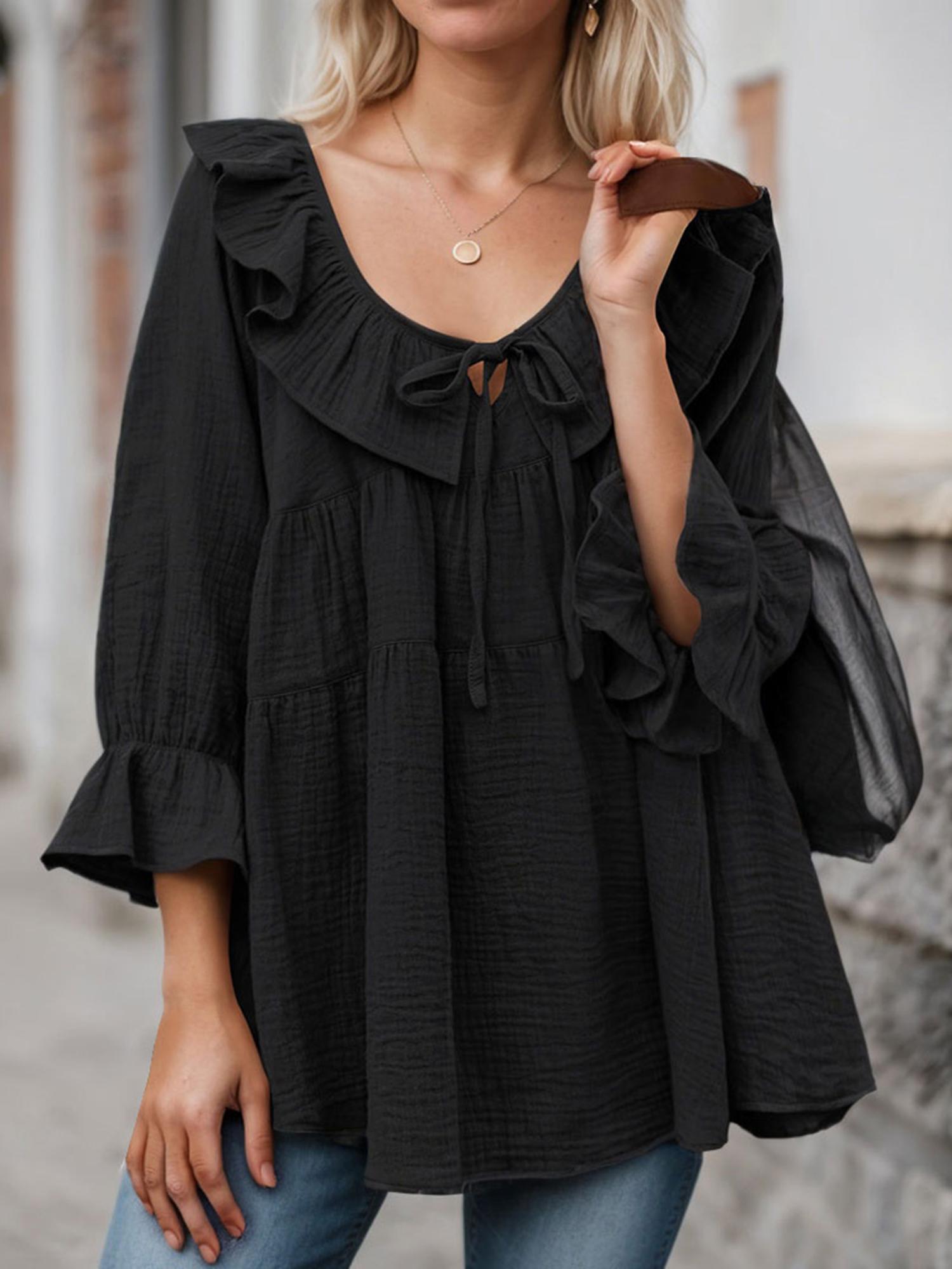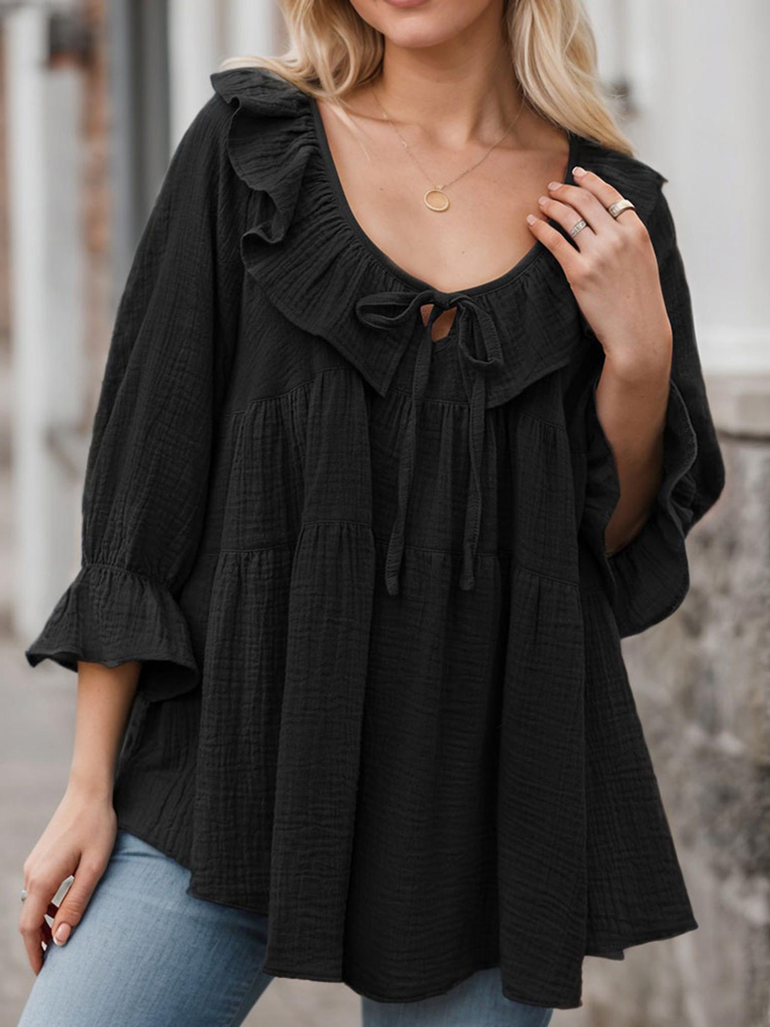 Features: Crew neck, puff sleeve, tie front,loose fit, solid color, ruffle tunic tops. Experience the ultimate blend of style and comfort this season with our trendy blouses - a true must-have for any fashion-conscious woman