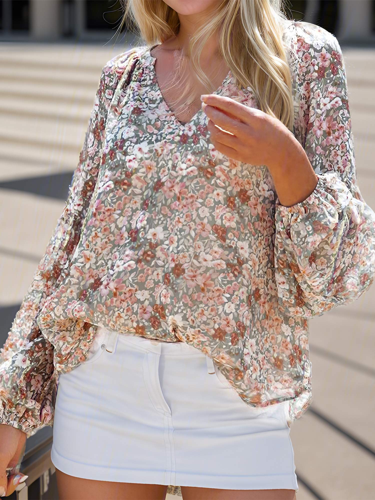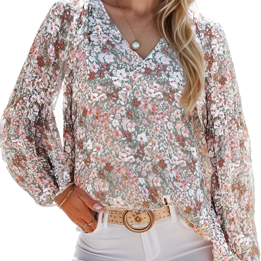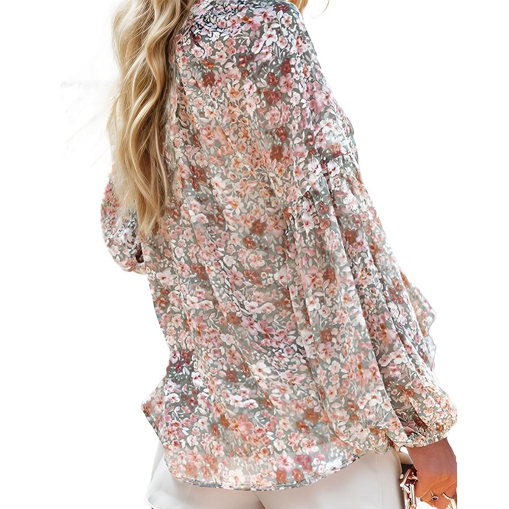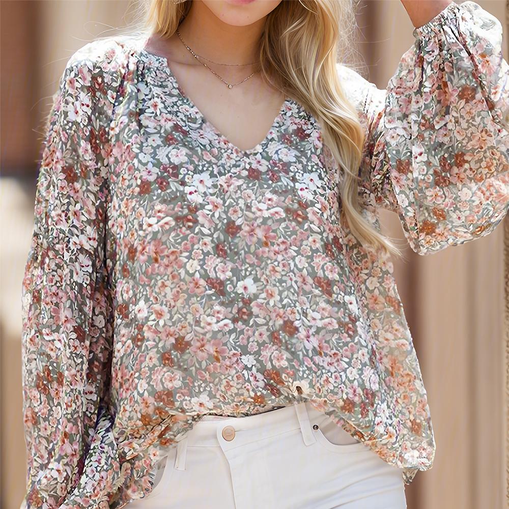 Women's Casual Floral Print V Neck Long Sleeve Loose Blouses Shirts Tops