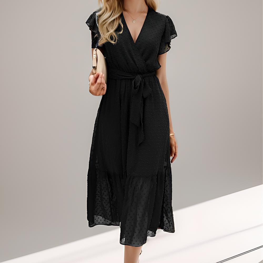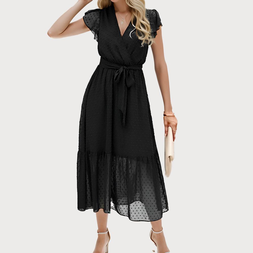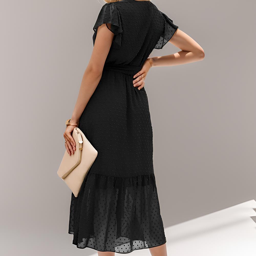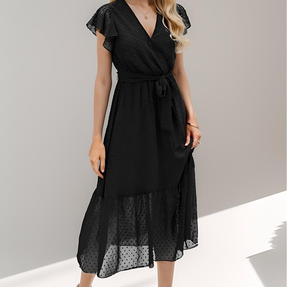 Women Summer Casual Wrap V Neck Ruffle Cap Sleeveless Belt A-Line Pleated Hem Midi Sun Dress