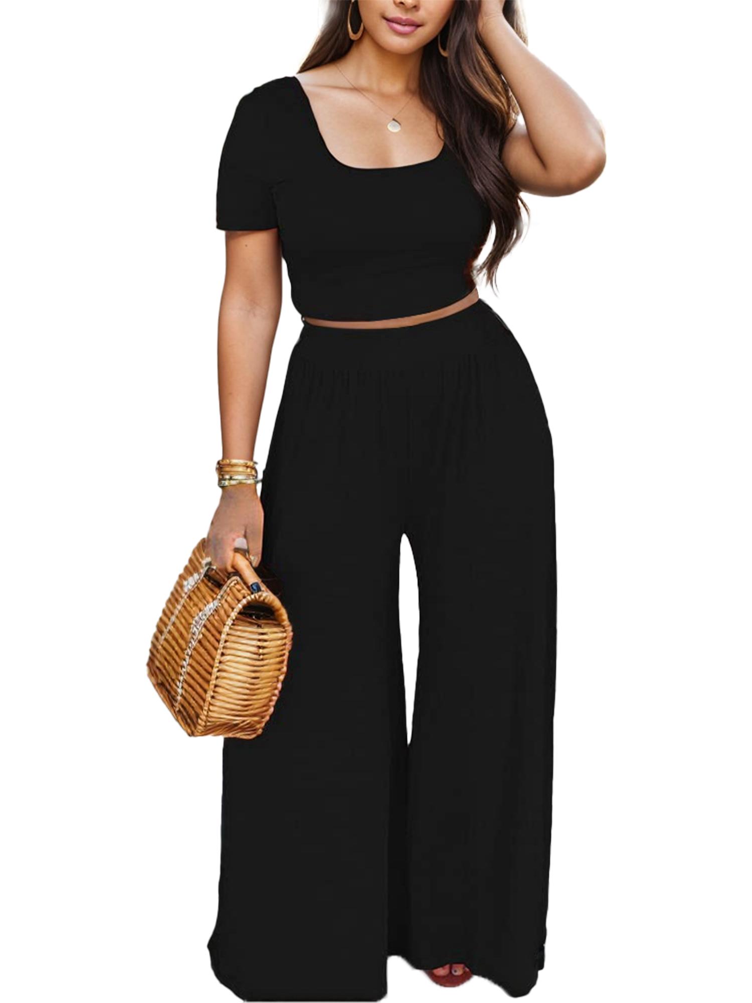 Womens 2 Piece Outfits Backless Short Sleeve Crop Top High Waist Wide Leg Long Pant Sets Tracksuit Sport Set