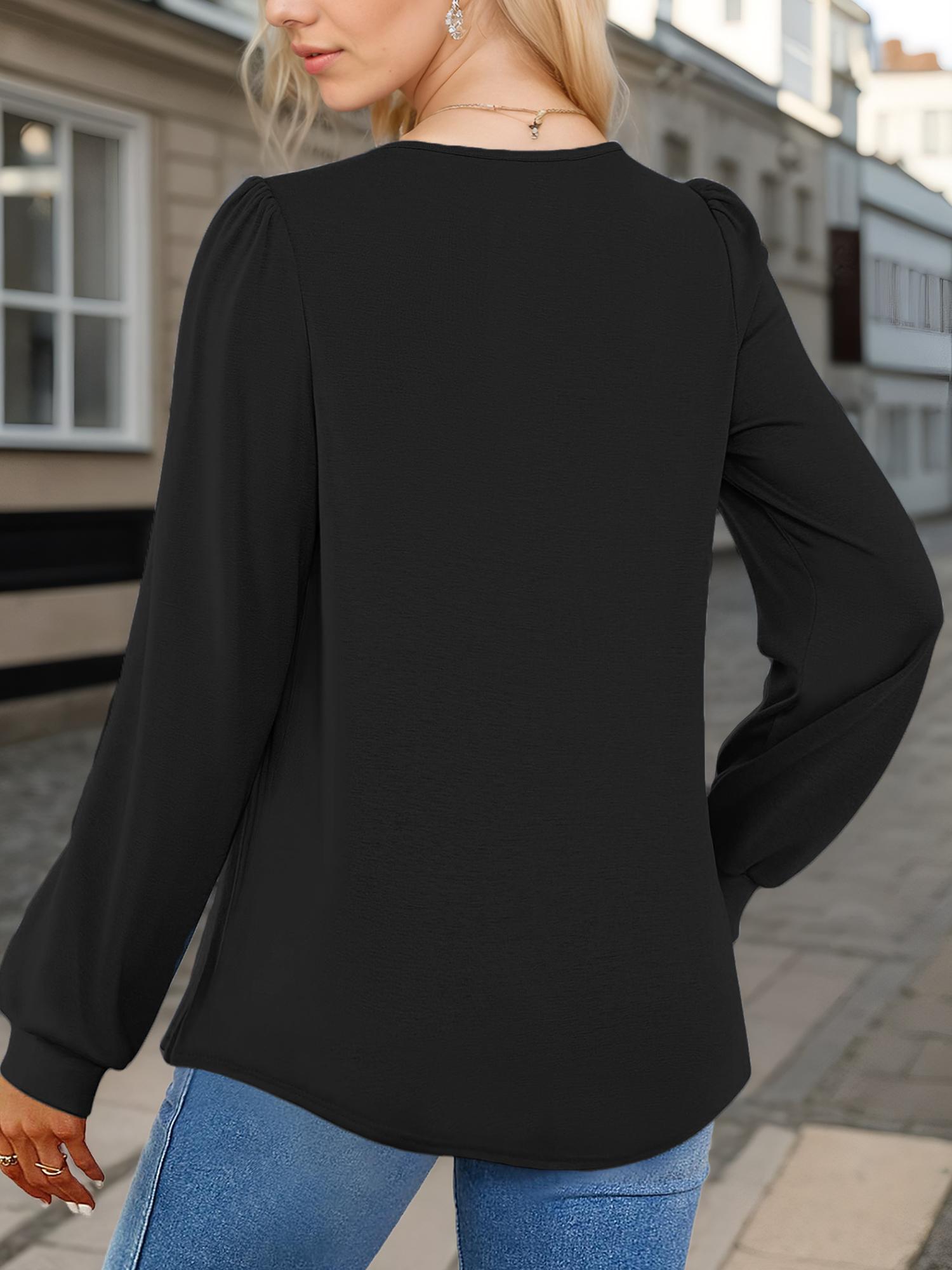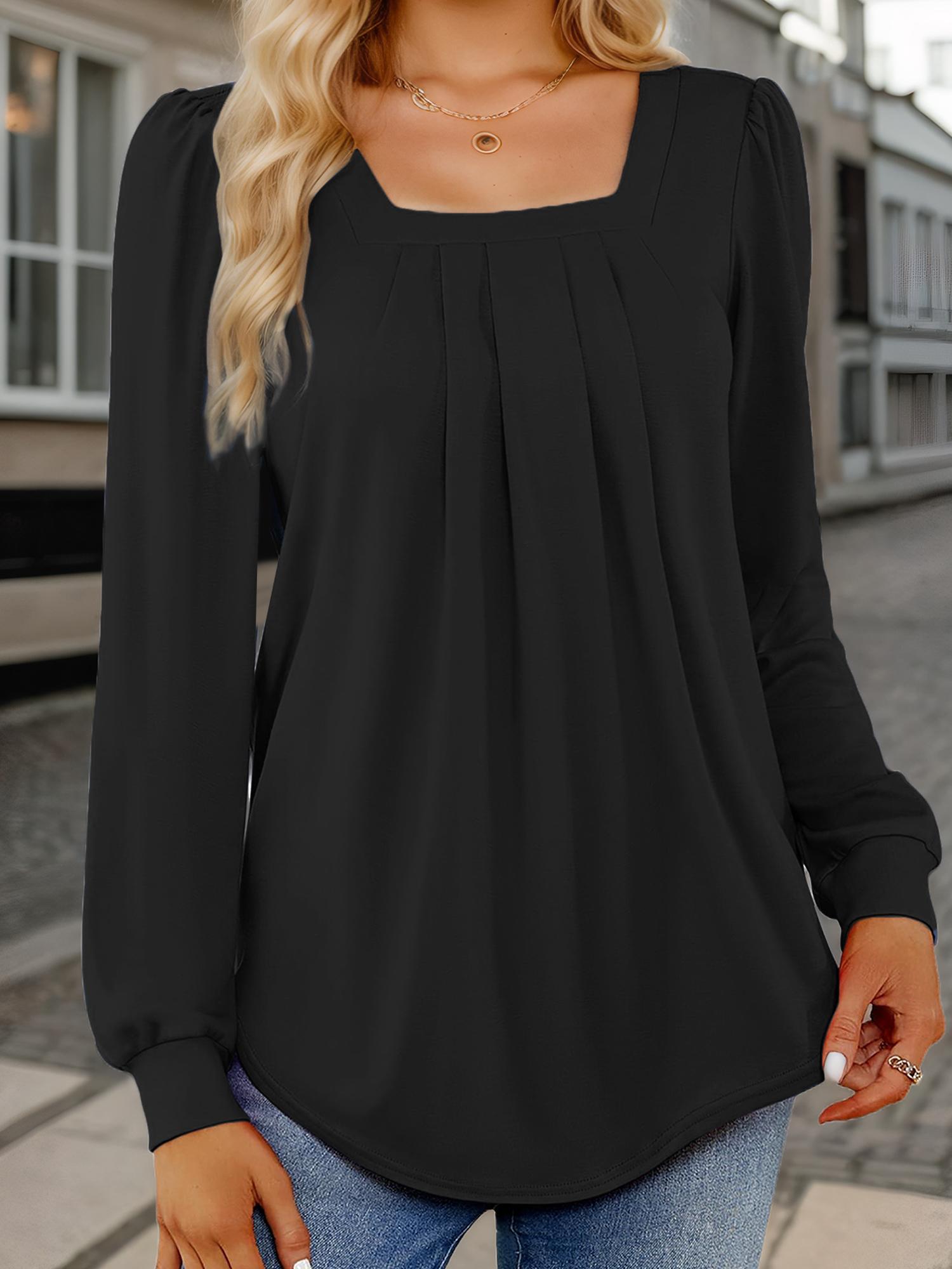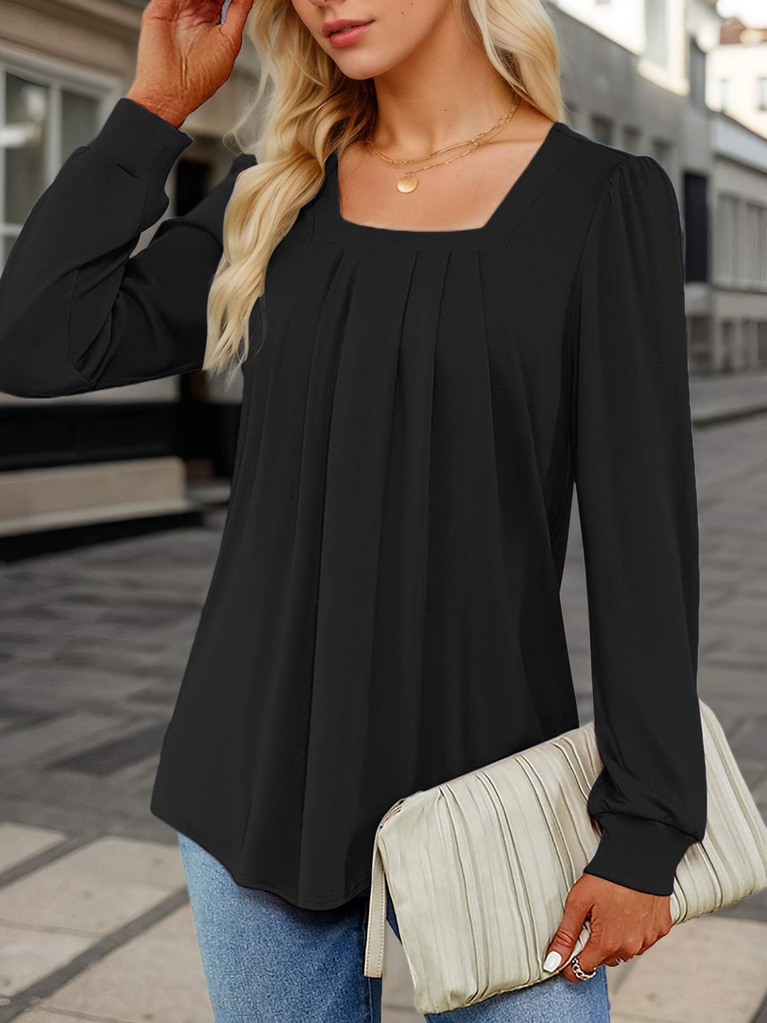 Women's Casual Square Neck Long Sleeve Tops Pleated Loose Blouses Shirts