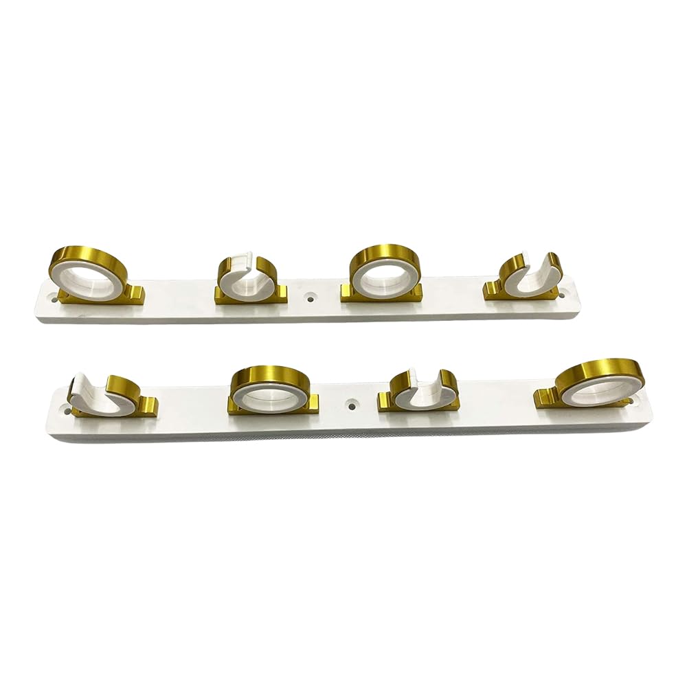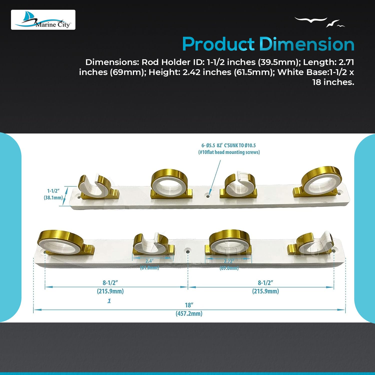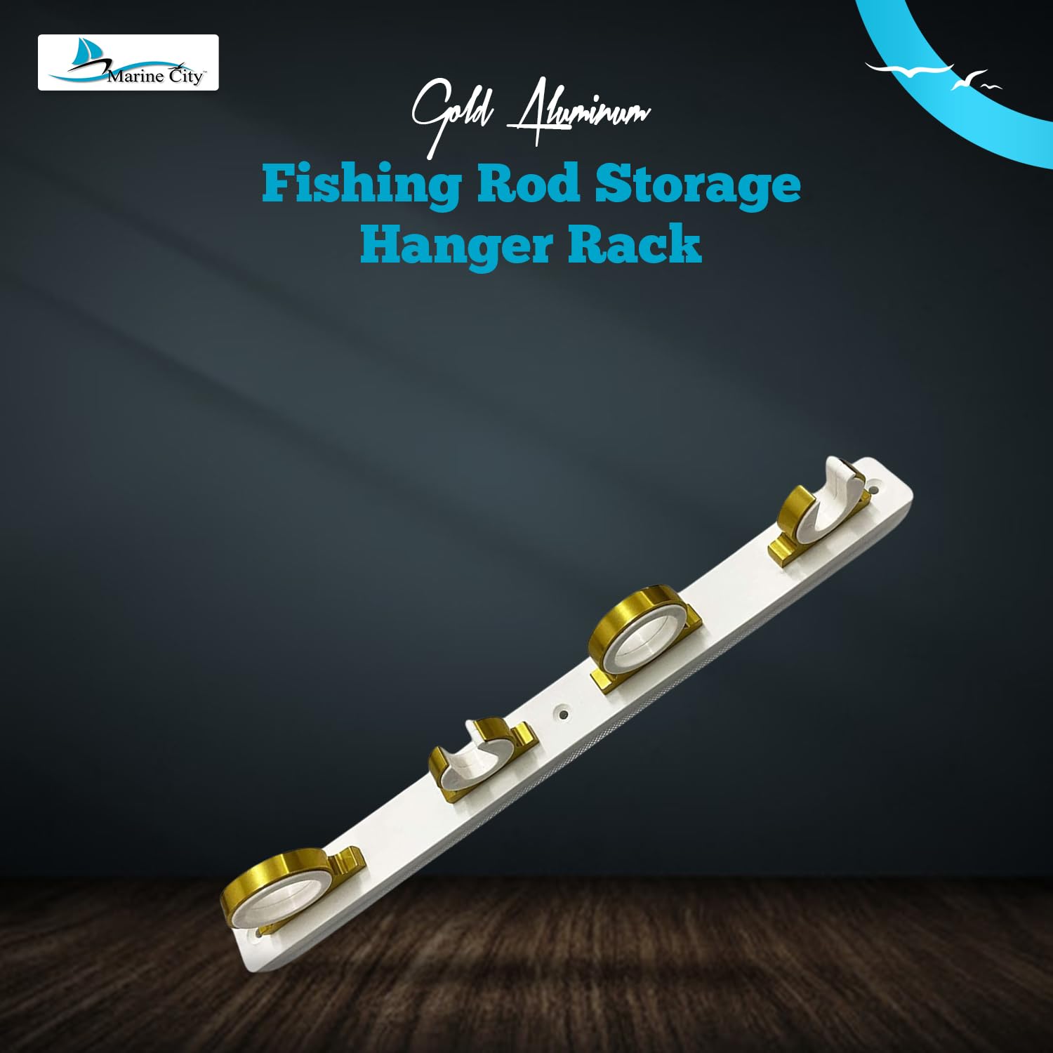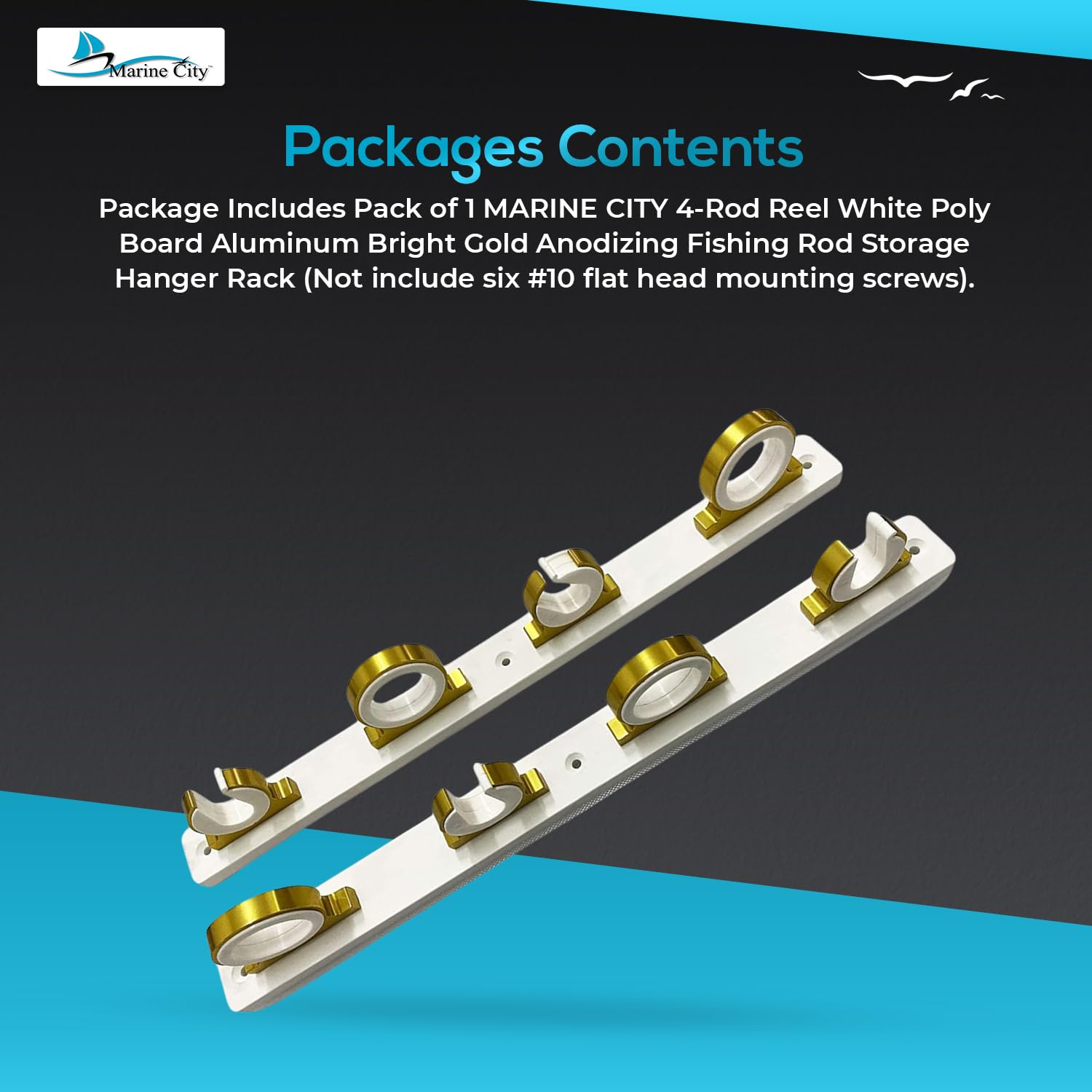• Package Includes Pack of 1 MARINE CITY 4-Rod Reel White Poly Board Aluminum Bright Gold Anodizing Fishing Rod Storage Hanger Rack (Not include six #10 flat head mounting screws).