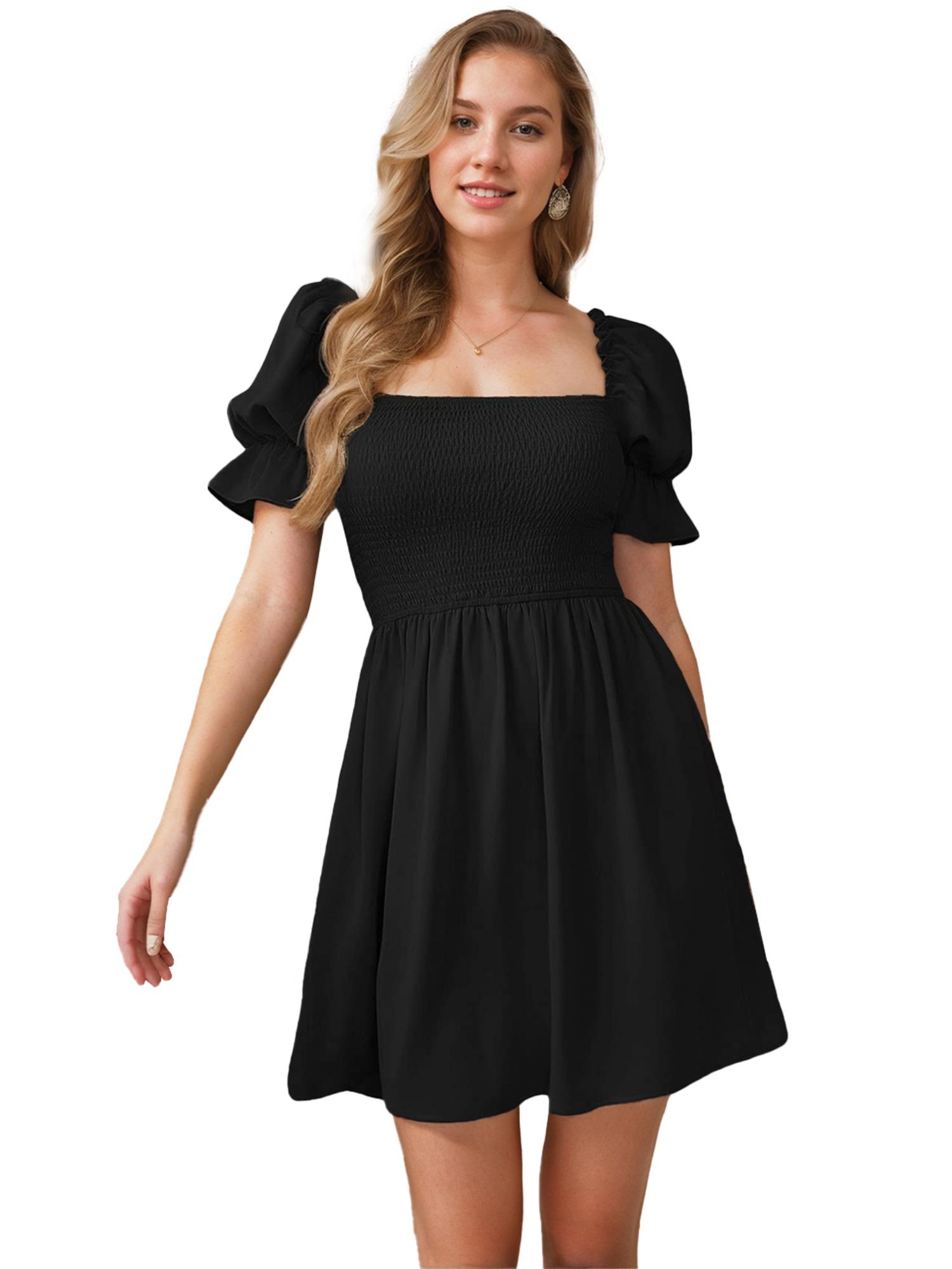 Women's Square Neck Flounce Short Sleeve Shirred Ruffle Hem Dress