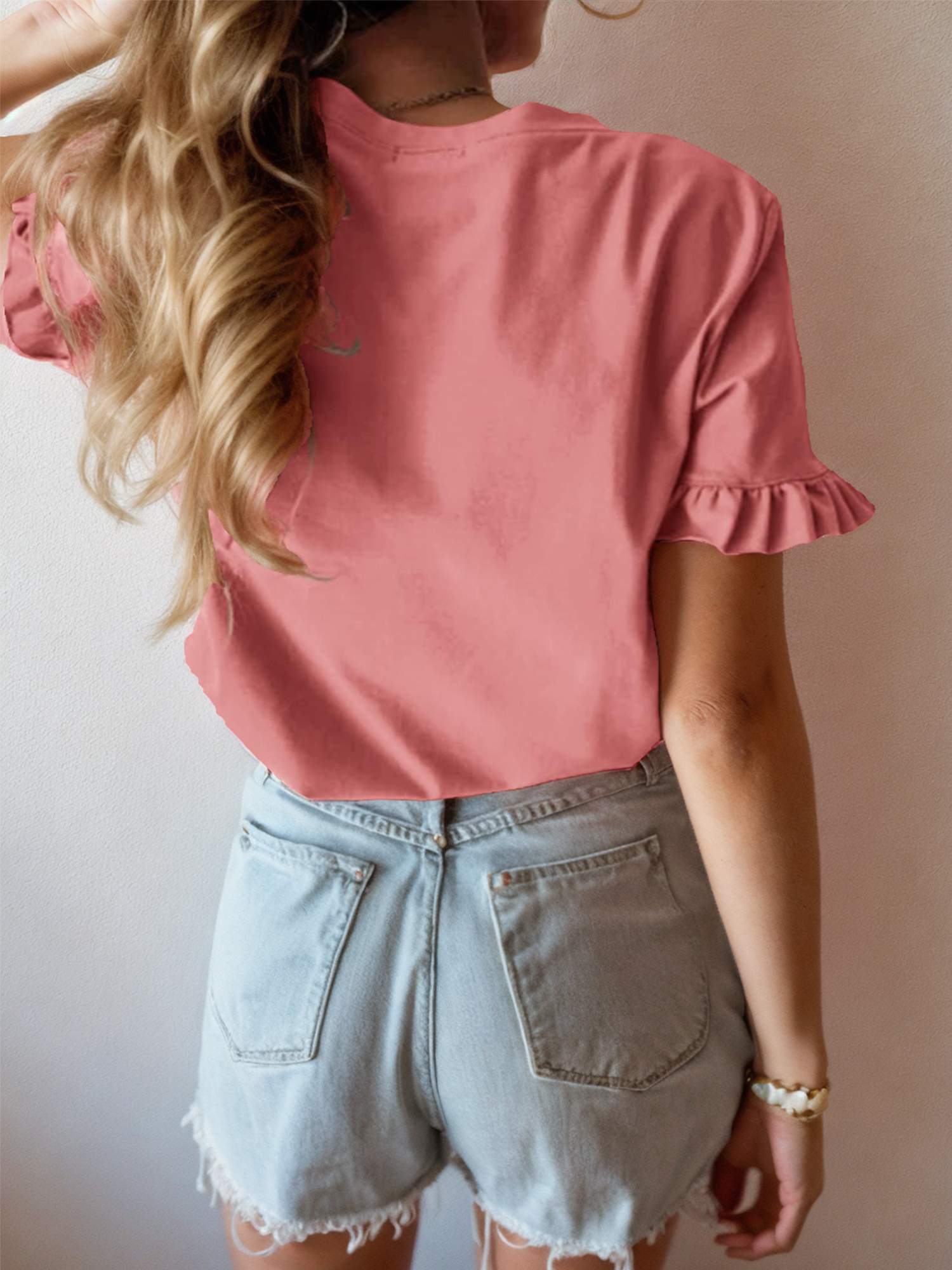 Women's Short Sleeve Casual T Shirts Summer Ruffle Plain Round Neck Loose Fit Tee Blouse Tops