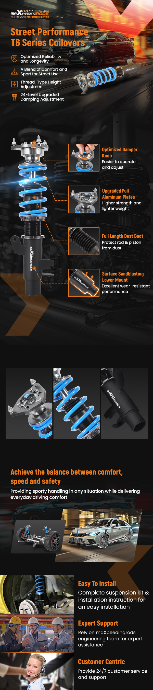 MaXpeedingrods T6 lowering coilover, features 24 clicks adjustable rebound damping, independent ride height and spring tension settings, developed high viscosity index damping oil, 55CrSi steel cold-bent springs and decent outlook to provide perfect balance between comfort and performance. This suspension system is ideal for daily driving and occasional, light track use. High quality components are adopted to ensure product durability and stability. Each application is fully test fitted and completely road tested to guarantee all our customers perfect performance and comfort expectations.