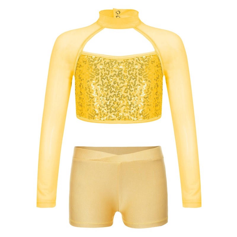 The long sleeve crop top with sequins that sparkle under the light to brighten up any performance.