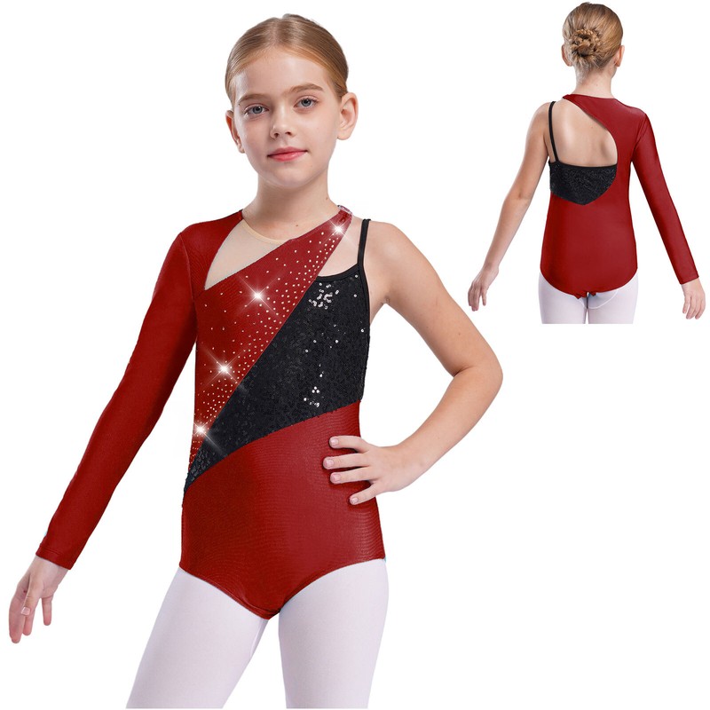 Girl’s leotard with color block and sequins is eye-catching enough to makes your child the spotlight in any performance.