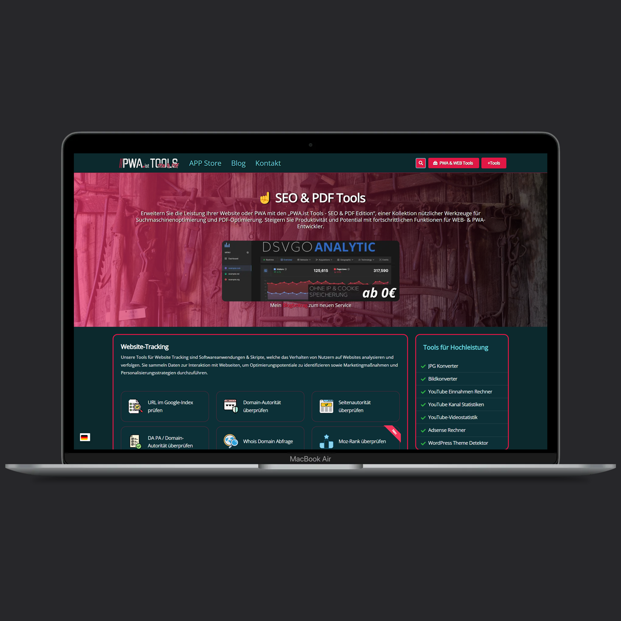 Analytics: Im Preis sind 2 Jahre meines Agentur Analytics-Services inklusive. Die Besonderheit ist, dass diese Lösung weder Cookies noch IPs auswertet und dadurch -theoretisch- nicht per Cookie-Banner bestätigt werden muss (wenn Sie YouTube-Videos in der Anwendung haben, brauchen Sie mindestens dafür trotzdem Consent)
