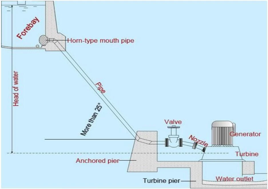 5. Anchor block: at the water diversion pipe joint and turbine nozzle, the pipe bears the maximum pressure, so a anchor block must be built with stone or concrete to fix the metal pipe.