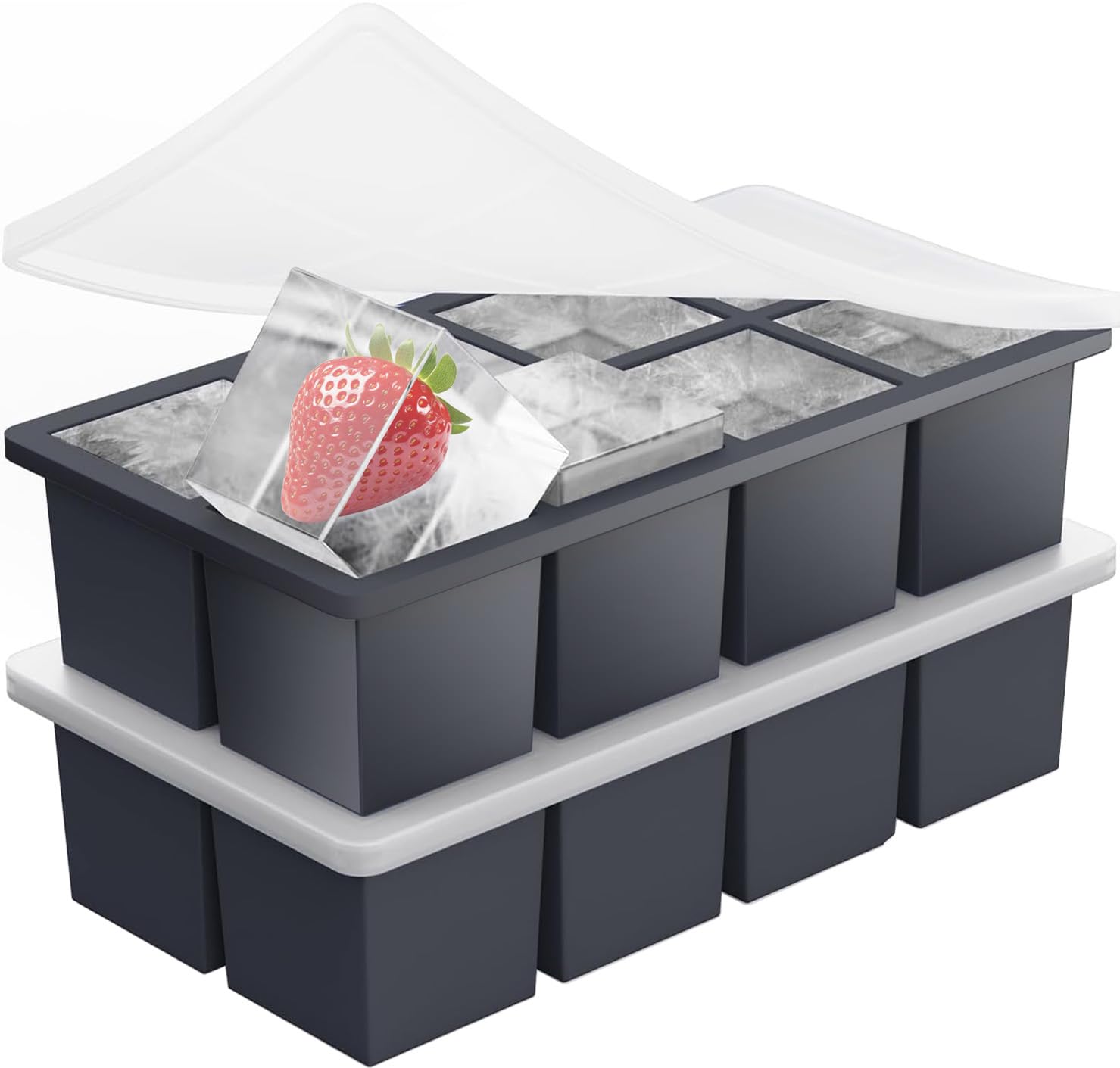 2 Pack Large Silicone Ice Cube Molds Square Ice Cube Trays with Lids for Freezer