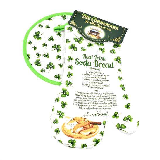 A recipe for delicious Irish soda bread is printed on the front making this mitt the ultimate in convenient kitchenware. A pot holder with a matching shamrock illustration completes this set of two.