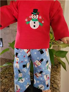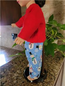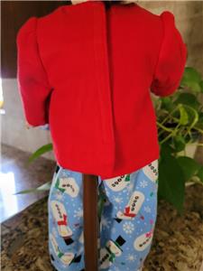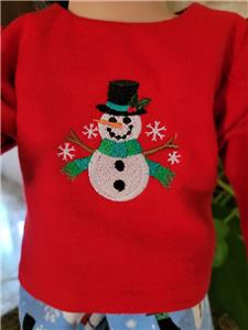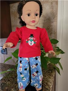 These cute pajamas fit 18" American Girl or similar dolls. The pajama top is made from 100% cotton red flannel with an embroidered snowman on the front. The back closure is Velcro. The pajama pants are made from 100% cotton flannel with cute snowmen and snowflakes on a blue background. These have an elastic waist casing. These are very easy for little girls to dress their doll. These are modeled on a Madame Alexander doll.