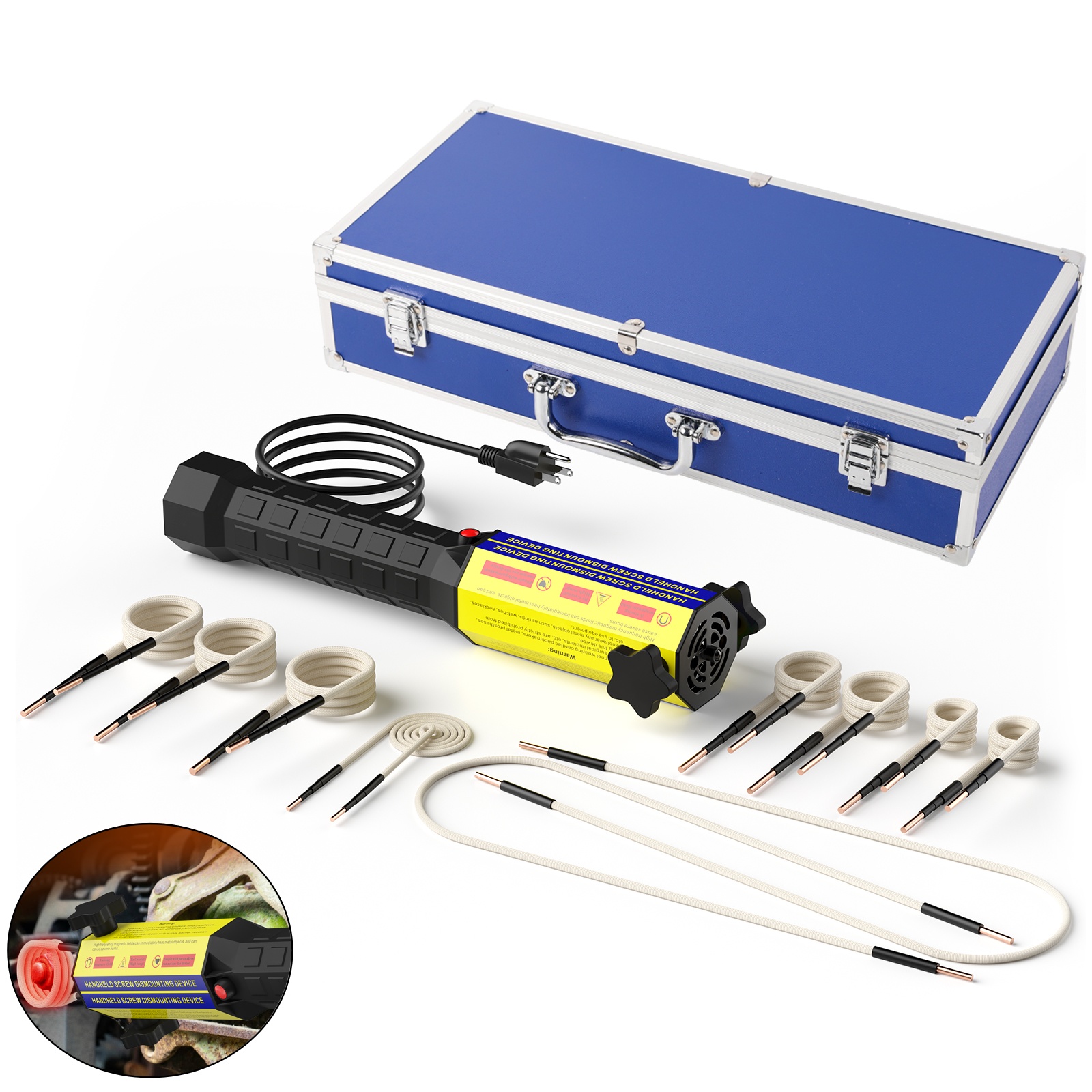 【Packing List】This latest model handheld bolt buster heat induction tool contains a induction heater, 10 coils (inner diameter Φ20mm*2, inner diameter Φ30mm*2, inner diameter Φ40mm*2, inner diameter Φ45mm*1, flat coil*1, soft copper wires*2), storage box *1 and user manual *1. Different sizes of heating coils are available for a variety of jobs.