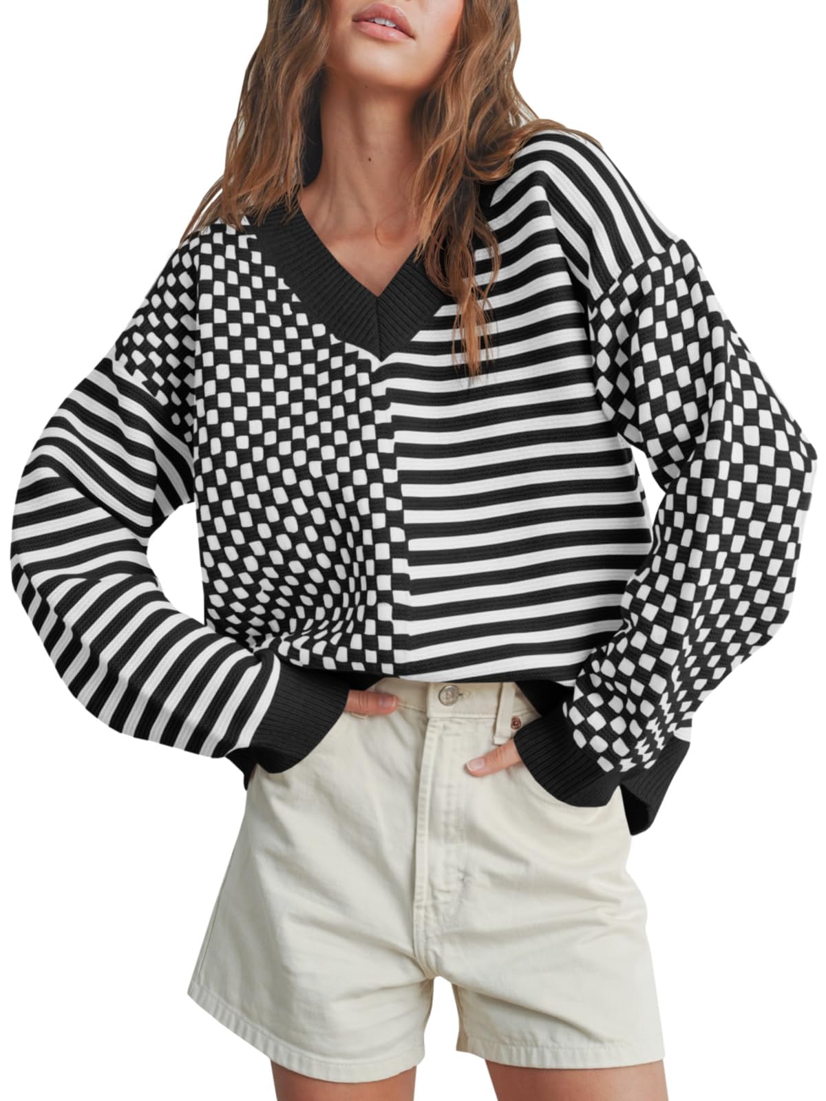 Saodimallsu Womens Checkered Striped Sweater V Neck Long Sleeve Black XL