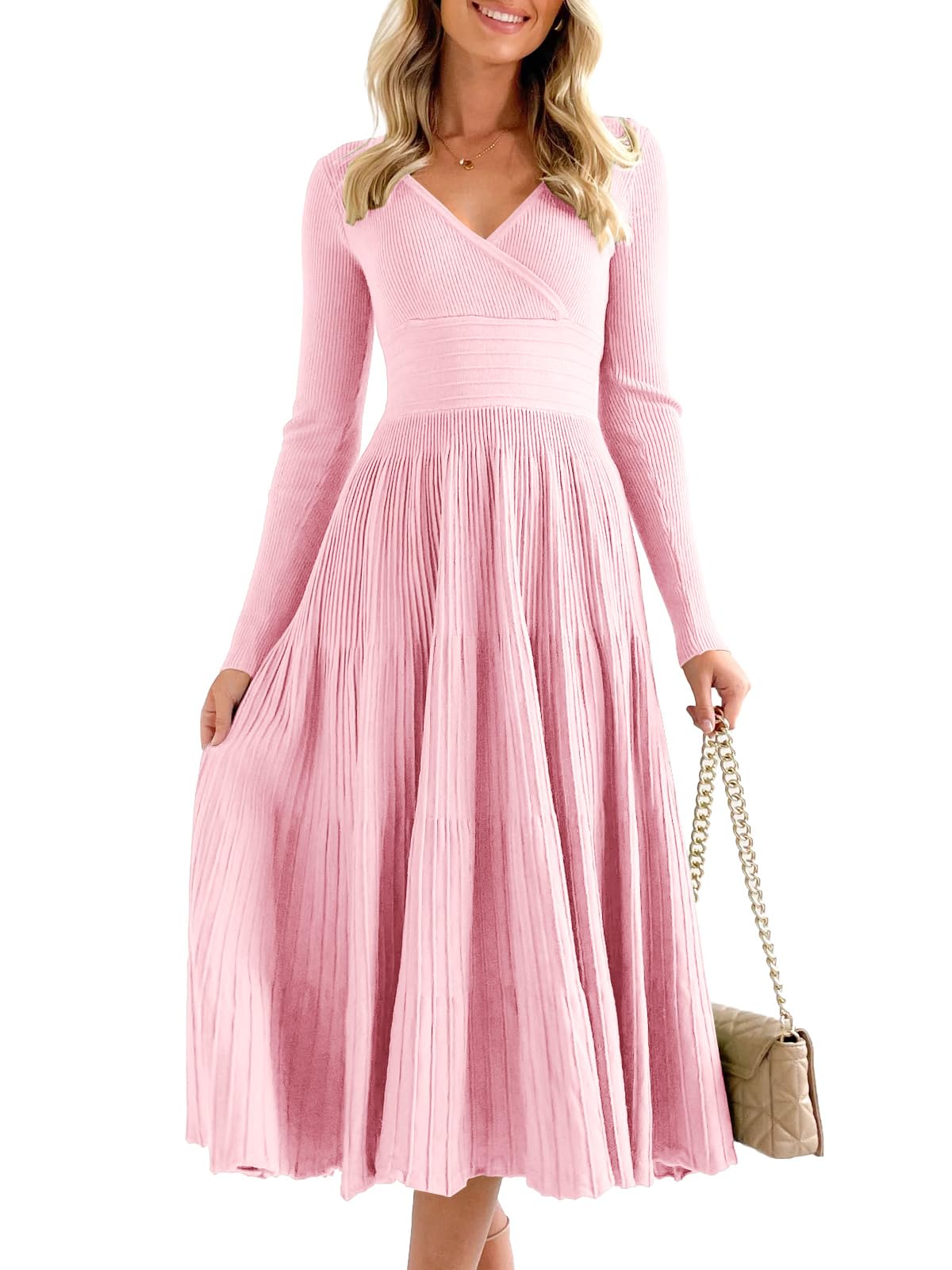 Upgrade your wardrobe with this Long Sleeve Pleated A Line V Neck Elegant Knit Midi Dress. Perfect for the fall and winter seasons, this sweater dress features a wrap style with a flattering V neck design. The pleated A-line silhouette creates a fit and flare look that is both stylish and comfortable. Made from high-quality knit fabric, this flowy dresses is soft, cozy, and perfect for cooler weather. Whether you're attending a special occasion or simply want to elevate your everyday style, this dress is a must-have addition to your collection.