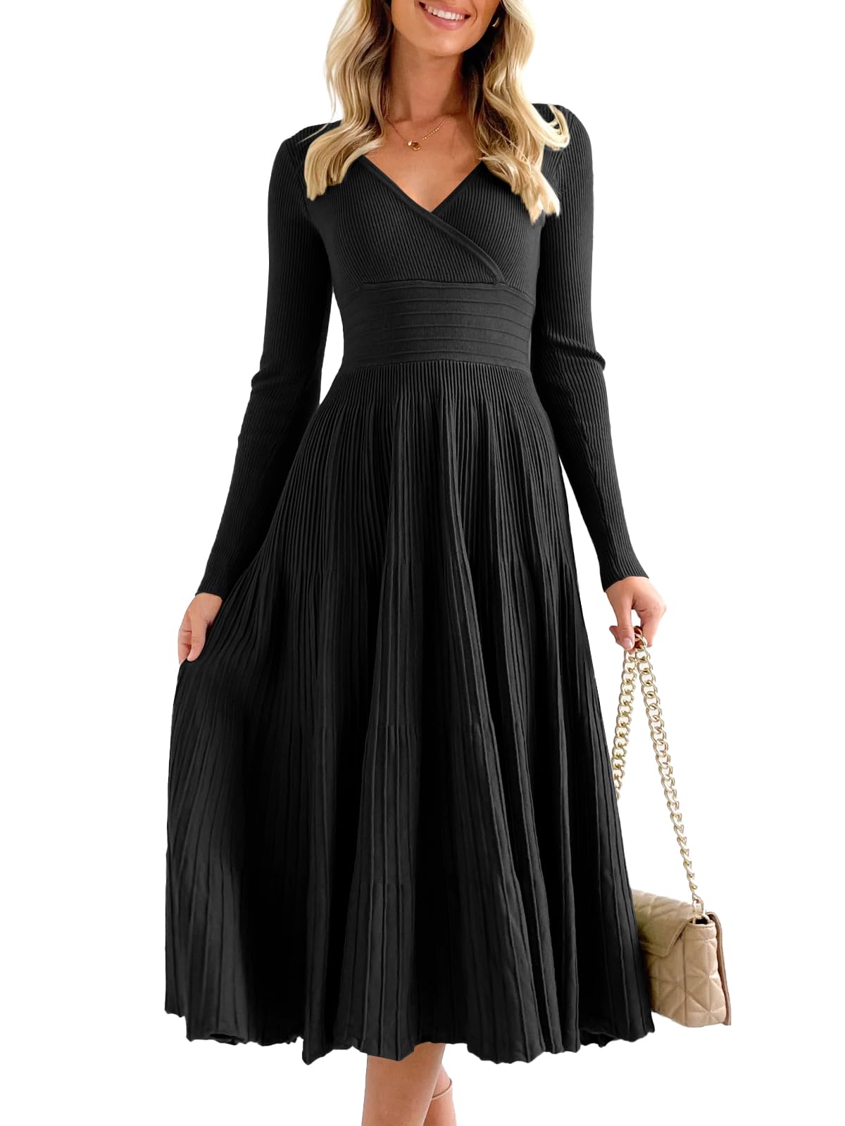 Upgrade your wardrobe with this Long Sleeve Pleated A Line V Neck Elegant Knit Midi Dress. Perfect for the fall and winter seasons, this sweater dress features a wrap style with a flattering V neck design. The pleated A-line silhouette creates a fit and flare look that is both stylish and comfortable. Made from high-quality knit fabric, this flowy dresses is soft, cozy, and perfect for cooler weather. Whether you're attending a special occasion or simply want to elevate your everyday style, this dress is a must-have addition to your collection.
