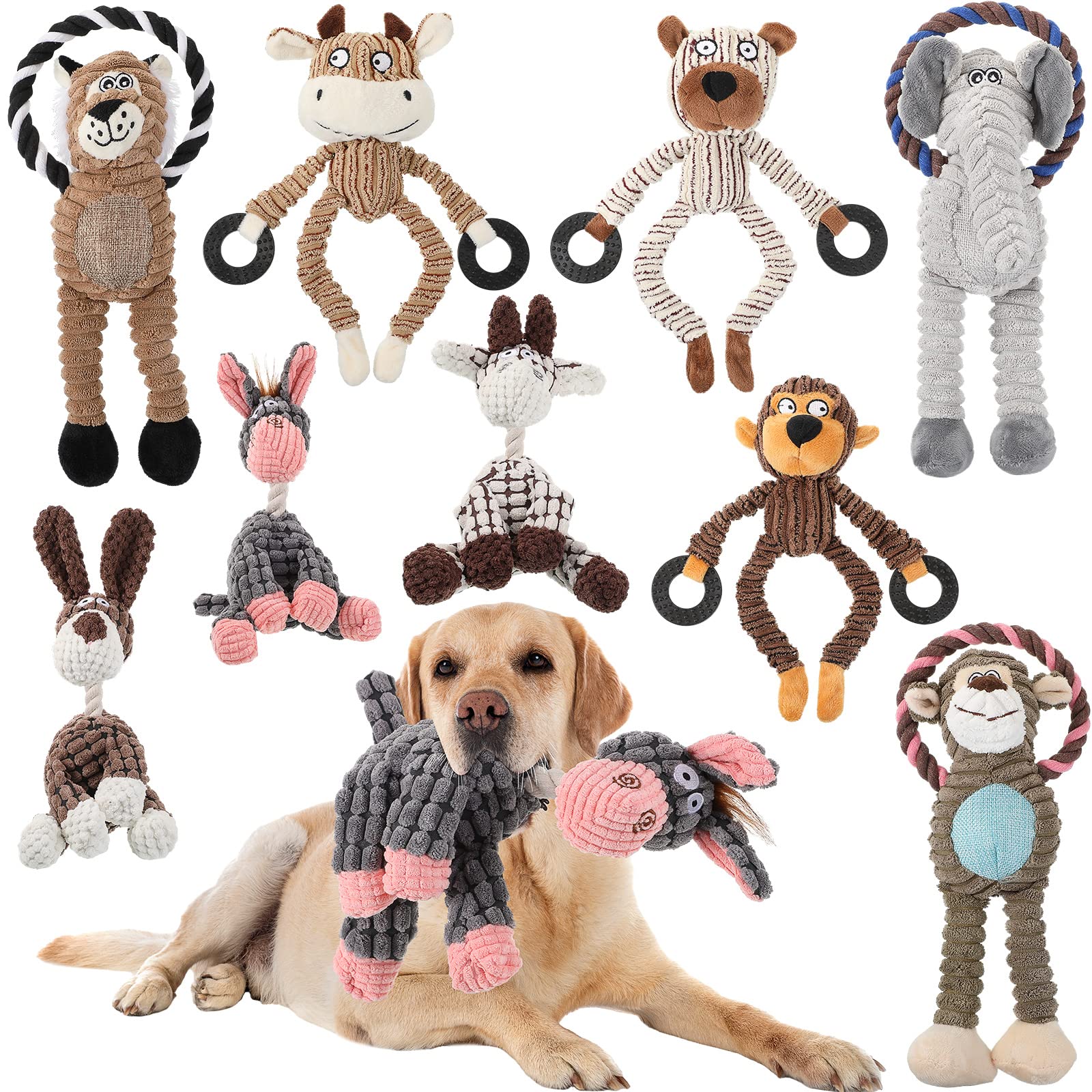 Features: Dog stuffed toys have 9 different styles, so your pets can choose different one to play according to their preference, suitable for indoor and outdoor, and grab pet's attentions and avoid the risk of their scratching your furniture and personal items. Stuffed toys for dogs have squeak sound can attract dogs and cats well, they are washable, teething clean and durable, not easy to break or deform, which can be applied for a long time. Specifications: Material: polyester Color: as shown in the pictures Size: as shown in the pictures Package includes: 9 x Dog squeaky chew toys Notes: Manual measurement, please allow slight errors on size. The color may exist a slight difference due to different screen displays. Only suitable for small and medium sized pets, not for aggressive chewers.